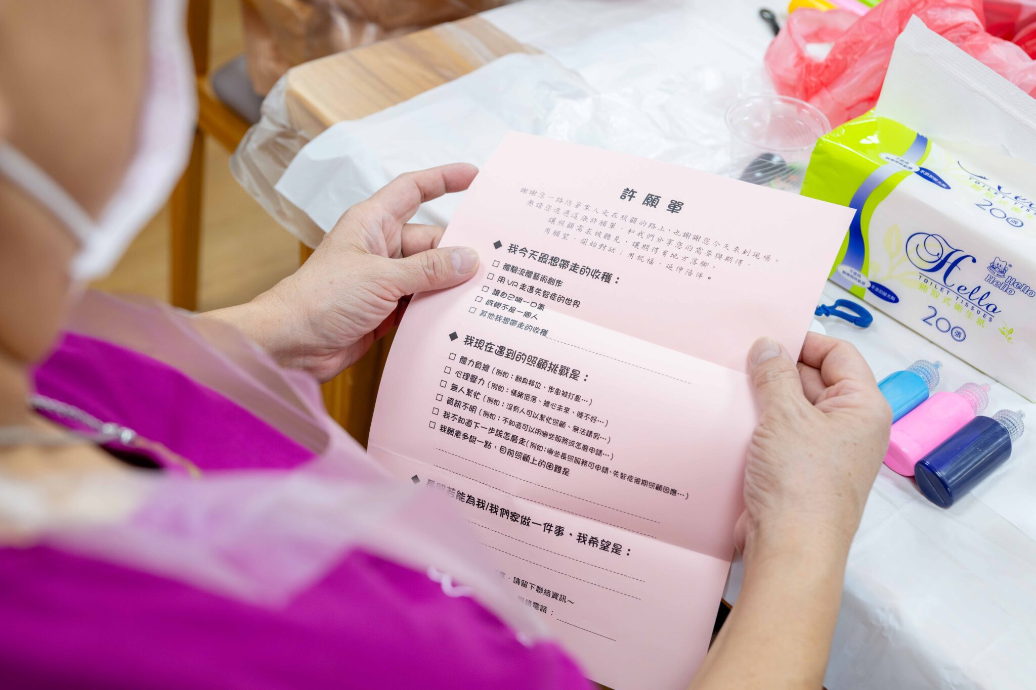 壓軸的活動是「願望分享與抽祝福卡」,讓家庭照顧者寫下自已的期待,與他人互相對話、彼此支持。最後透過扭蛋機抽出獲得專屬的祝福卡,一位家庭照顧者抽中「請記得休息,你也值得被照顧」,瞬間眼眶泛淚地說:「這句話好像在提醒我,也要好好照顧自己。」