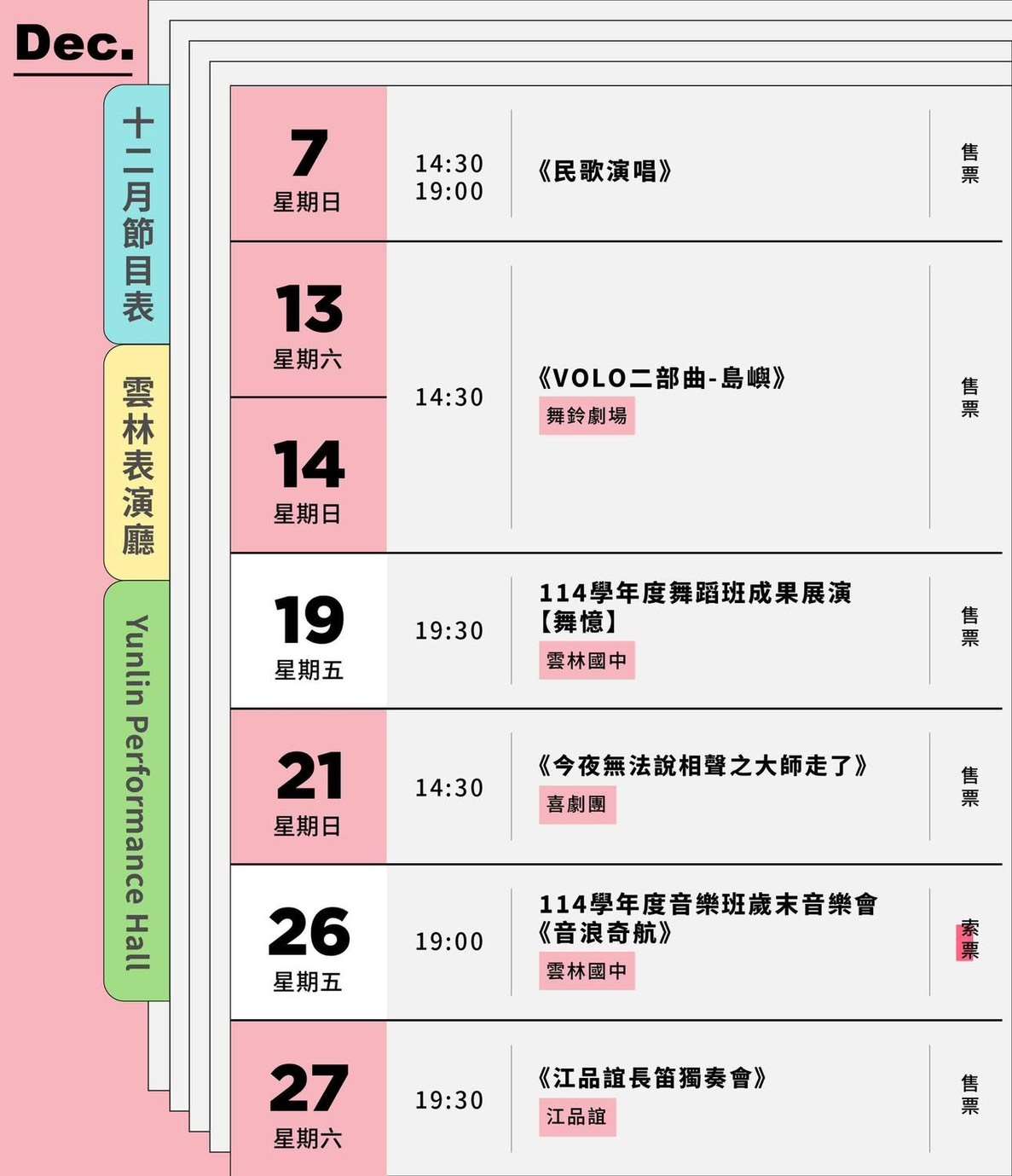 🔹詳細活動資訊可至Facebook粉絲專頁「雲林表演廳」查詢https://www.facebook.com/yunlinperformance/?locale=zh_TW