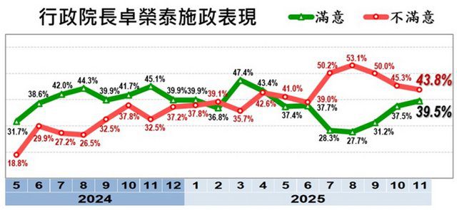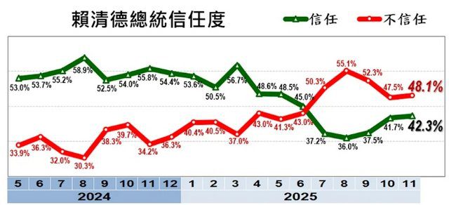 綜合報導/《美麗島電子報》今天公布“11月民調”,在賴清德總統滿意度方面,40.9%滿意,比上月略增0.8個百分點,53.3%不滿意,與上月比例相同。民調指出,不滿意賴清德執政者已連續5個月超過半數。信任度仍呈分歧42.3%表示信任,比上月微增0.6個百分點,而48.1%不信任,同樣比上月微增0.6個百分點,另有9.6%尚未明確回答。 針對防務預算議題,75.6%民眾認為明年國防相關經費占政府總預算約3分之1的比例“太高”,該群體中75.6%表態不信任賴清德。而認為國防預算占比“剛好或太低”的民眾,則有超過5成7信任賴清德。此外,認為兩岸已無必要維持以往九二共識者,有72.6%信任賴清德、20.0%不信任;認為兩岸並非同屬一中者,則有55.7%信任、34.7%不信任。 根據《美麗島電子報》1日公布的11月民調,有16.4%很信任賴清德、25.9%還算信任,另有9.5%很不信任賴清德、18.6%有點不信任,透過交叉分析可見,在高屏、70歲以上、國小以下學歷及泛綠民眾等族群中,超過半數信任賴清德,本次調查也顯示年齡層愈高、學歷愈低者,相對愈信任賴賴清德。 ![]() 相較之下,男性、新北市、中彰投、基宜、花東及離島、20至29歲與40至59歲族群、專科以上學歷,以及民眾黨支持者、泛藍及中立民眾等群體,則超過半數傾向不信任,且學歷愈高者亦相對愈不信任賴清德。 至於本月對賴清德執政整體表現之滿意度,民調顯示40.9%滿意,比上月略增0.8個百分點,其中有11.4%很滿意、29.5%還算滿意,同時也有53.3%的民眾不滿意,與上月比例相同,其中有30.8%很不滿意、22.5%有點不滿意,此外有5.8%未明確回答。民調指出,不滿意賴清德執政者已連續5個月超過半數,且本月不滿意度仍高出滿意度12.4個百分點,執政評價同樣未能回到7月大罷免投票前水平。 在行政院施政評價部分,民眾本月對卓榮泰的整體表現,有39.5%滿意,比上月增加2.0個百分點,其中有10.1%很滿意、29.4%還算滿意;而有43.8%不滿意,則比上月減少1.5個百分點,其中有26.0%很不滿意、17.8%有點不滿意,另有16.7%未明確回答。民調分析認為,民眾本月對卓院長的施政滿意度已大致接近罷免投票前的評價。 本次民調由美麗島電子報委託執行,委託單位為《美麗島電子報》,並由政治民調專家戴立安負責問卷設計與數據分析,同時委託《畢肯市場研究公司》執行電訪工作。調查範圍涵蓋全台22個縣市,受訪對象為設籍於調查區域、年滿20歲的民眾,調查時間為2025年11月24日至26日,採用電腦輔助電話訪問(CATI)方式執行,此次民調共成功完訪1079份樣本,其中住宅電話701人、行動電話378人,於95%信賴水準下抽樣誤差最大值為±3.0%。