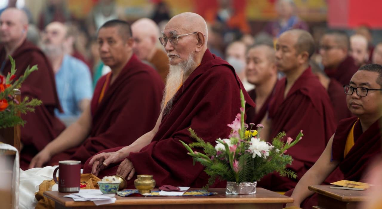 法會現場,伴隨傳統薩迦儀仗、法號、長號與祈願香燈,殿堂莊嚴肅穆。
