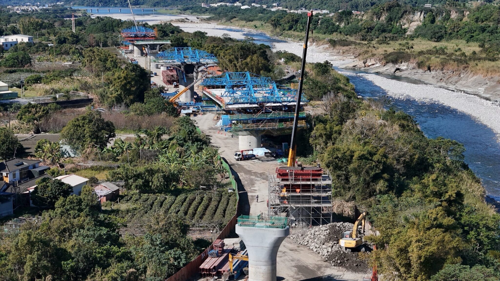 建設局長陳大田表示,市府建設團隊在缺工、缺料等挑戰下,仍全力推動「東豐快速道路工程」。其中,第3標工程銜接石岡至已完成的大甲溪橋梁段及東勢段,目前墩柱已成形,並安裝工作車展開橋面板施工,預計今年4月與舊橋接合,屆時,地方長年記憶中的斷橋將成為歷史,而第3標也將於115年完工搶先通車,進一步改善石岡至東勢的交通便捷性。