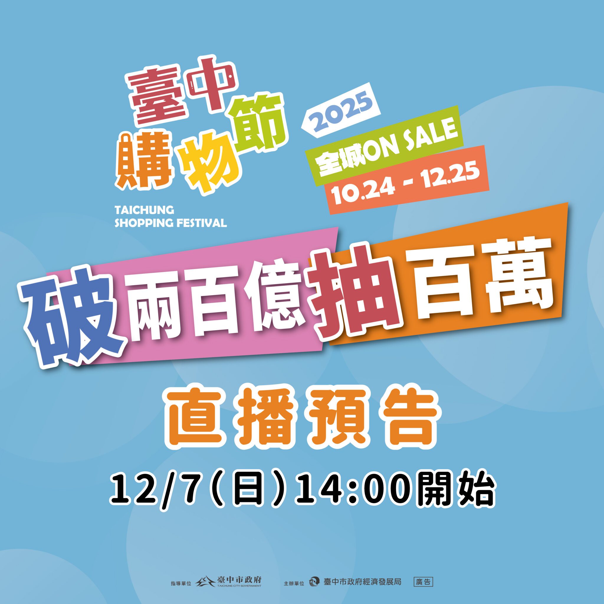 經發局提醒,12月7日下午2時,購物節將在大里公園舉辦「屯區GOGO購-破兩百億加碼抽百萬」活動,抽出今年第2個加碼百萬大獎及第二名外籍專屬抽1萬美金,現場還有憑台中通APP當日消費畫面兌換摸彩券,有70吋電視、50吋電視烤箱、氣炸鍋、廚餘機等多項精美家電好禮等您抽。詳細資訊請持續關注臉書粉絲團(https://www.facebook.com/shoppingtaichung/)。