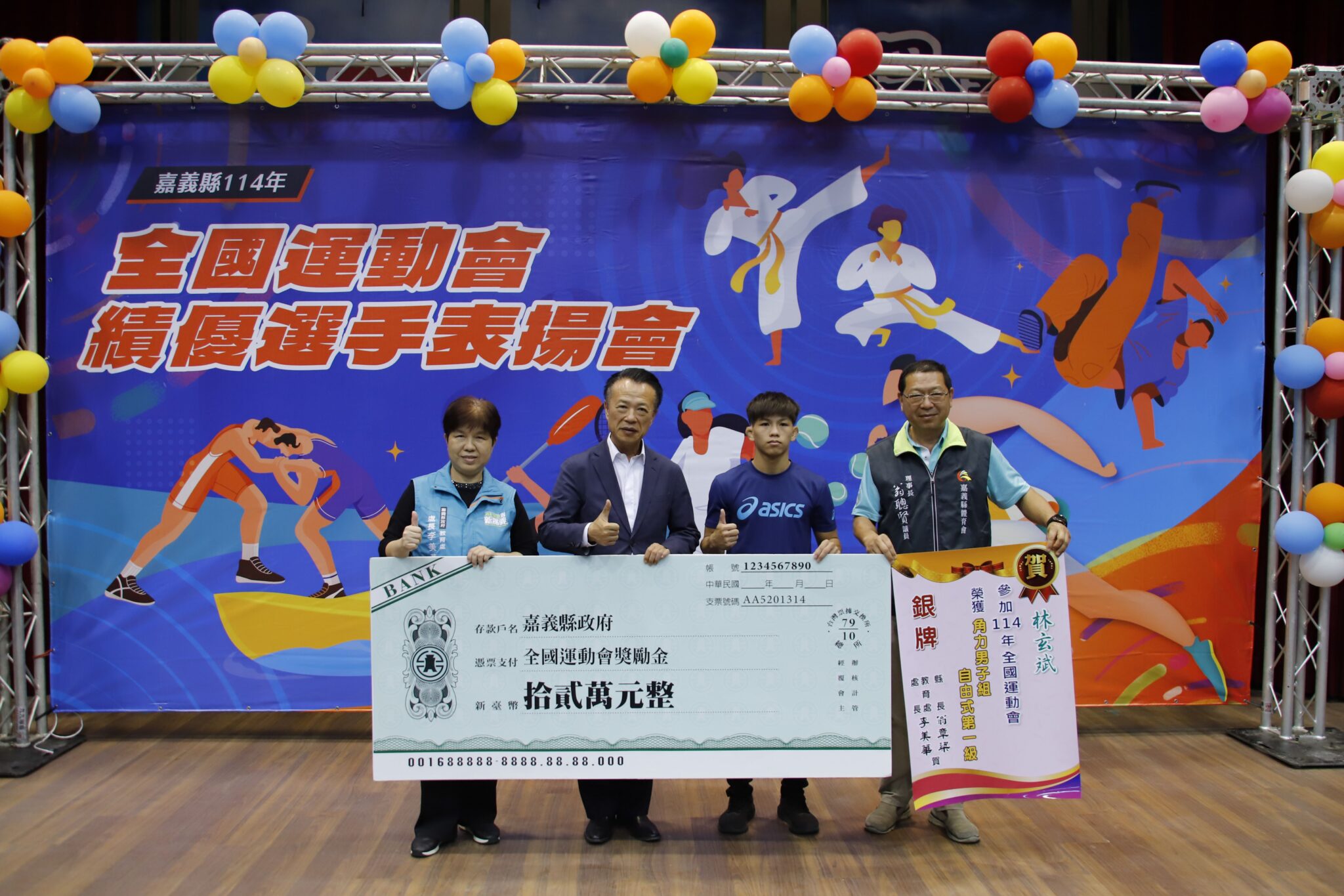 嘉義縣在114年全國運動會奪下2金4銀7銅佳績,縣府頒發301萬運動獎勵金,鼓勵他們勇往直前奪牌的決心,縣長翁章梁1日晚間在水上國小親自頒獎表揚嘉縣健兒。