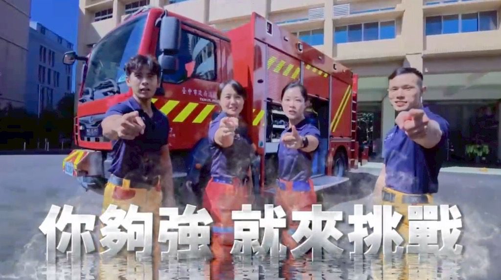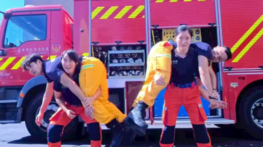 同一時間臺中市政府消防局也在臉書發布一則影片,用幽默趣味的形式展現同仁透過堅實訓練造就的強健體魄,以因應在火場救難的各種狀況。影片中扛起男同事的四平分隊楊敏加分享當時情況:「拍攝前夥伴突發奇想,問我們女孩子能否扛起80公斤的男生,這對經常要搬運傷患的我們來說問題不大,想不到因此創造出這個效(笑)果。」另一位參與演出的烏日分隊李熙軍強調:「沒有運動習慣的人一但進入火場,在能見度不足下常會表現緊張、喘不過氣連爬樓梯都難,透過訓練能幫助消防員在耐力、肌力的提升,甚至對心理素質也加強不少。」