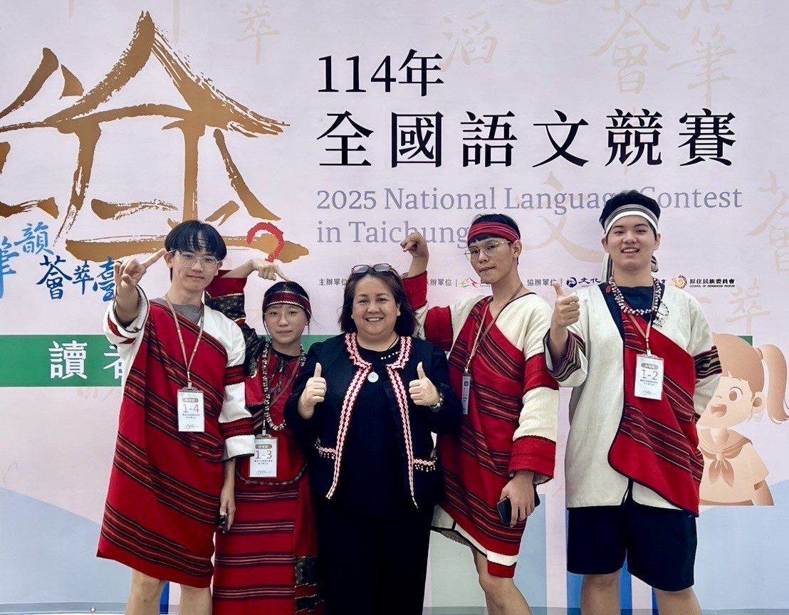 榮獲「台灣原住民族語言-高中組」特優的市立台中二中隊伍,由4位族語背景各異的學生組成,從一開始的生疏,到能穩定掌握語音細節,全靠踏實練習與勇往直前的精神。其中,洪雅樂同學擁有原住民與漢族的雙重背景,時常聽聞家人以族語交流,使她的學習更具文化連結與情感意義。