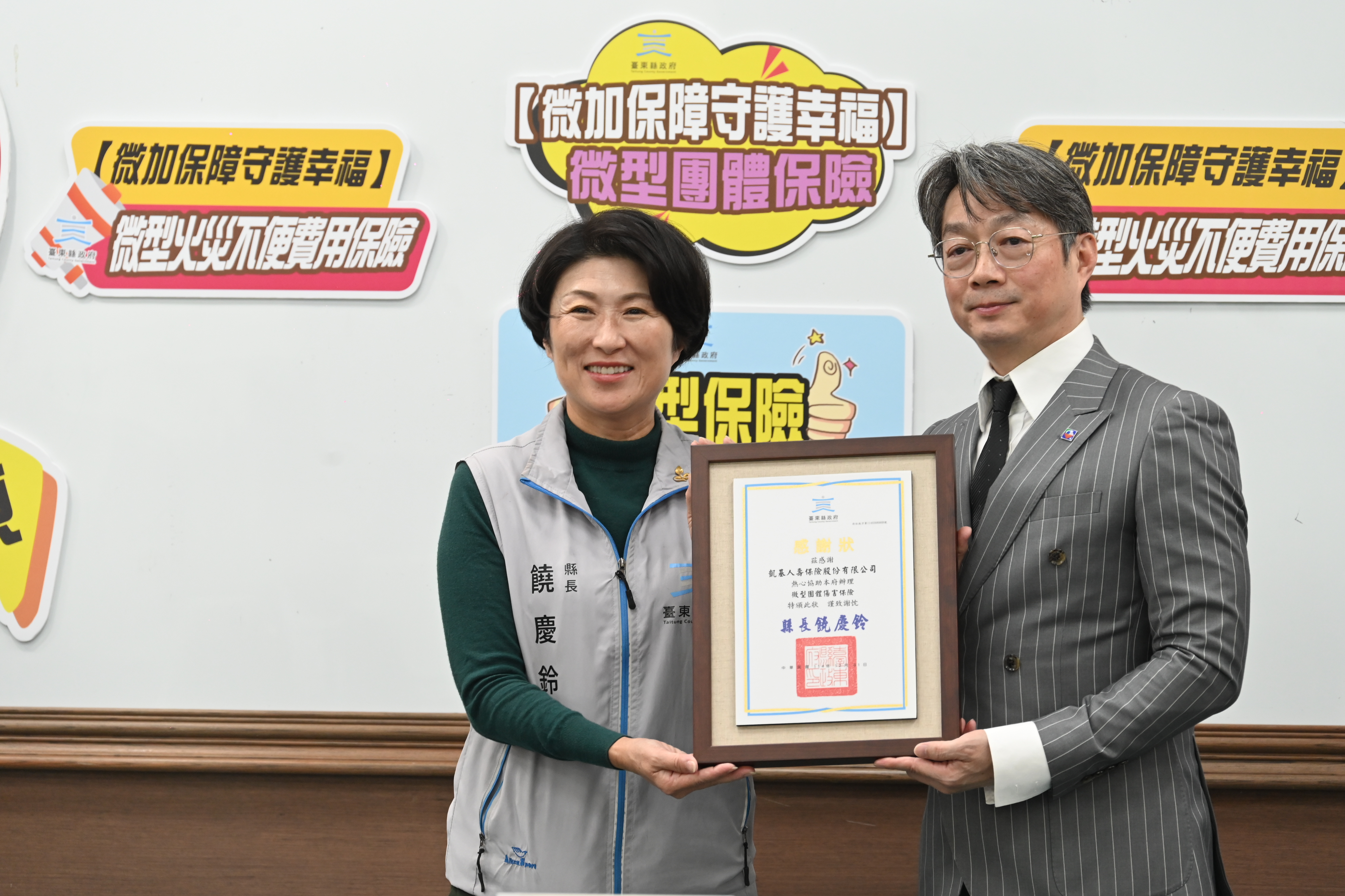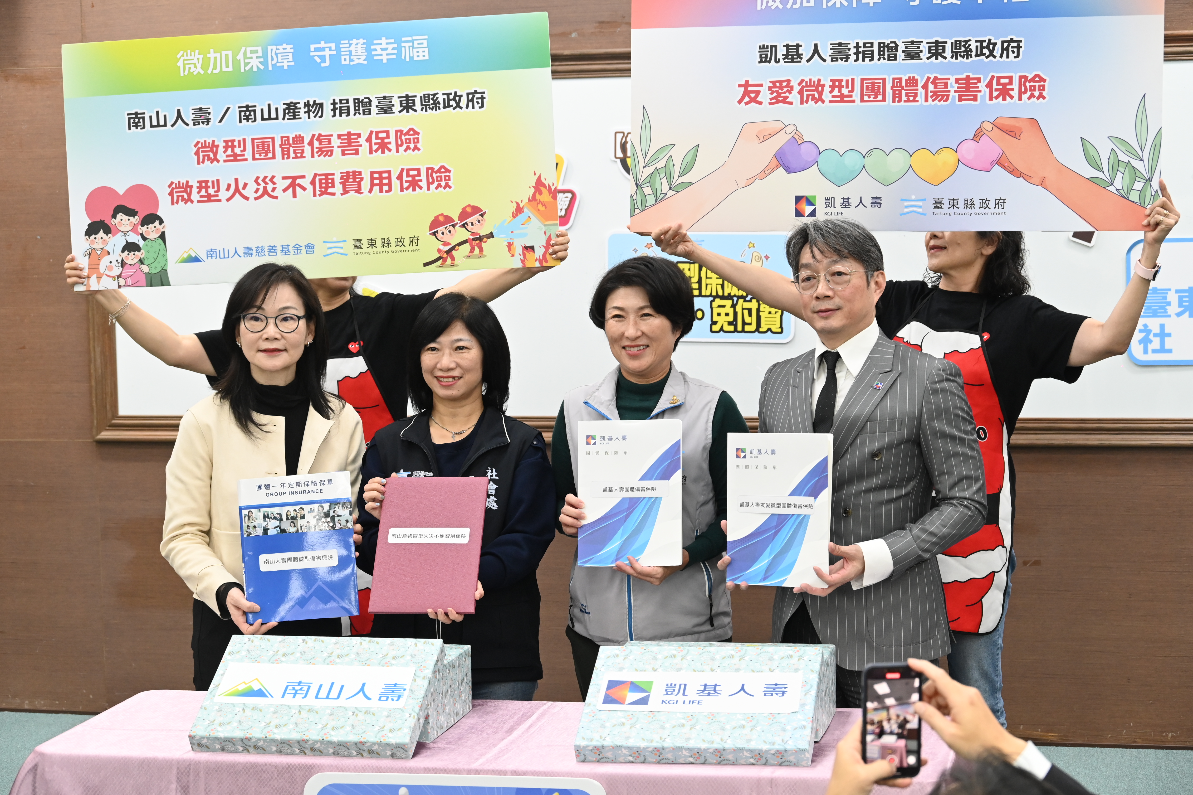 臺東在社會安全保障上更往前走一大步,臺東縣政府今(4)日舉辦「微加保障 守護幸福」微型保險感恩捐贈儀式,縣長饒慶鈴感謝凱基人壽、南山人壽、南山產物保險及南山人壽慈善基金會多年來與縣府攜手,為臺東弱勢家庭建構更完整的基礎保障。