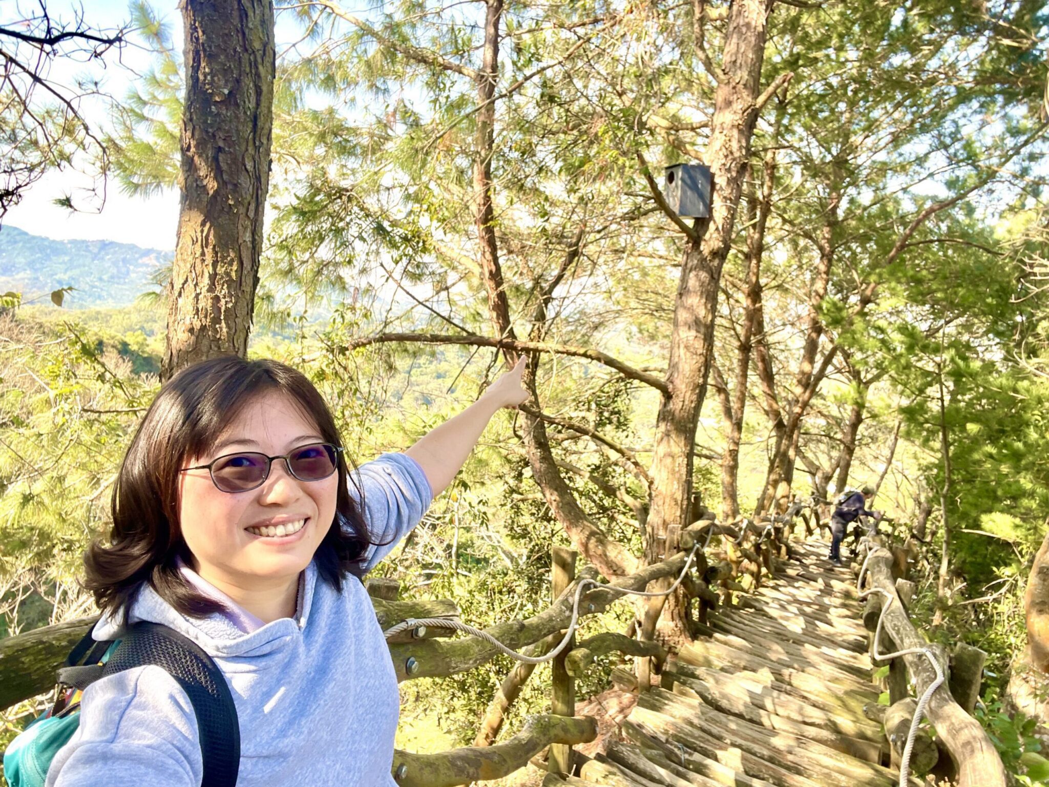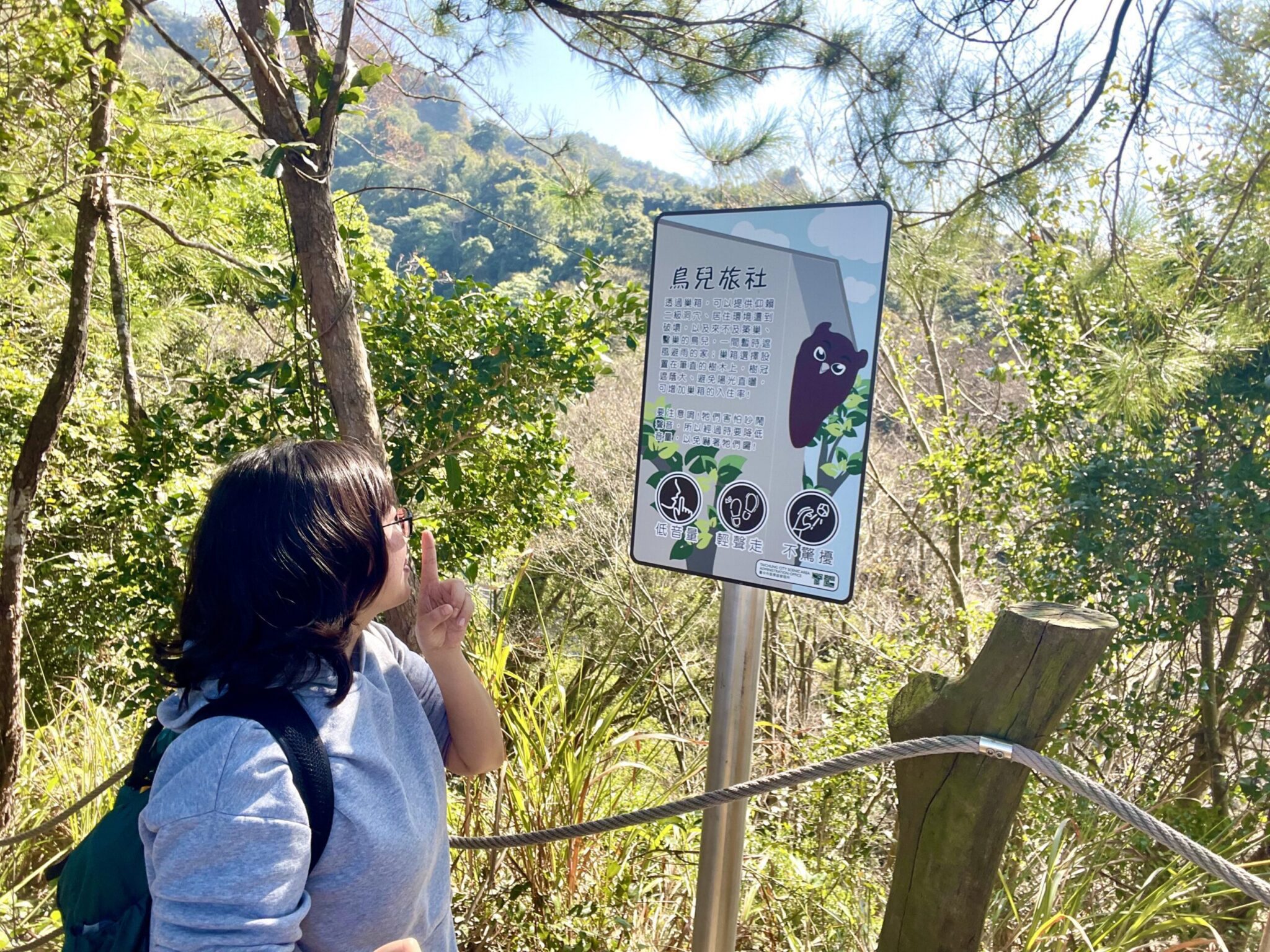 此外,許多鳥類探索相關設計融入步道中,包含鳥類的剪影、及常見鳥類嬌客的特色介紹,還有互動性導覽牌,步道中段還有一處樹木交織的綠色隧道,好似踏入龍貓秘境,秘境旁設立一處大坑客運鳥語線築巢站公車站牌,歡迎大家來此等待龍貓公車靠站。步道沿途還設有10處鳥兒旅社供鳥兒休息,幸運的山友可能巧遇前來旅社休息的鳥兒,觀旅局也提醒經過旅社群降低說話音量、輕聲走過,才不會把鳥兒嚇得不敢再來訪。