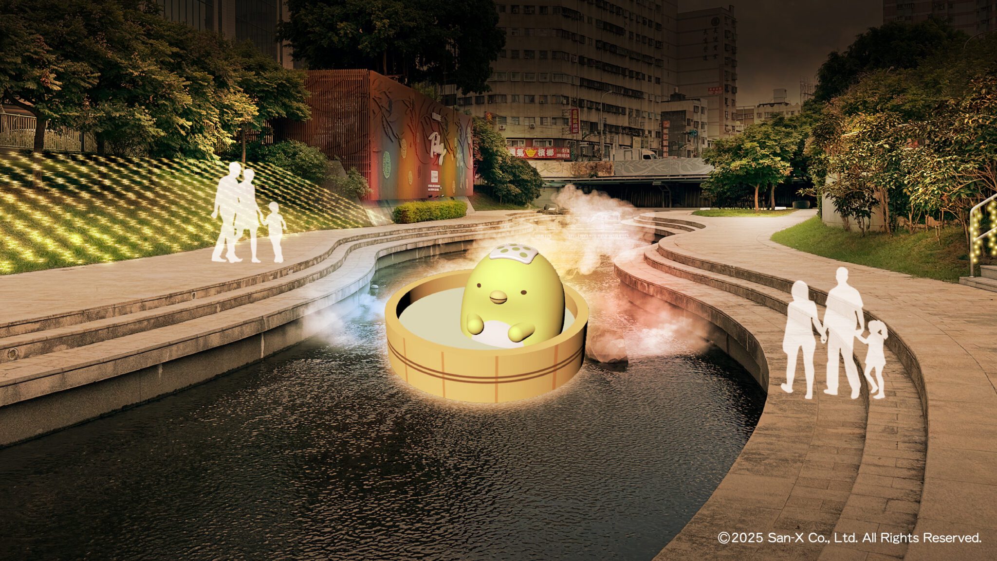 除了火車站前廣場,在柳川和綠川也打造多處充滿驚喜的特色燈飾。五位超人氣角色齊聚在柳川水舞台,與蜥蜴的母親共同化身超大型立體氣偶「蜥望舞伴」,搭配歡樂療癒的水舞燈光秀,點亮河畔夜色,成為今年最甜蜜的節慶風景;還有「來企泡湯」主題燈飾,可見企鵝?坐在湯桶上,周圍煙霧繚繞,彷彿置身谷關溫泉;「白熊好品」則呈現白熊在冰塊上喝好茶的樣子;美食界人氣王炸豬排與炸蝦尾則在民權路「炸物食堂」驚喜亮相,增添逛燈樂趣。