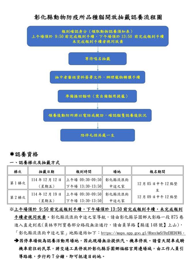 動防所將分批開放二梯次4場次,分別為114年12月12日及114年12月19日於彰化縣流浪狗中途之家辦理公開認養作業,當日上午場須於9點50分前完成報到手續,下午場須於13點50分前完成報到手續,未完成報到手續者視同放棄,參與抽籤人員需出示國民身分證正本審核確認是否符合資格始得參與抽籤,如果同一隻貓有多人登記認養,當日將唱名依編號放置籤桶,以公開抽籤方式決定認養人,民眾可至「全國動物收容管理系統」網頁查詢待認養貓隻之照片與基本資料,認養之民眾先至報名網址https://forms.gle/bNCZMpXJ8RfMqnyS8登記報名,每人以登記1隻貓咪為限,詳細報名資訊可至本縣動物防疫所最新消息查詢。