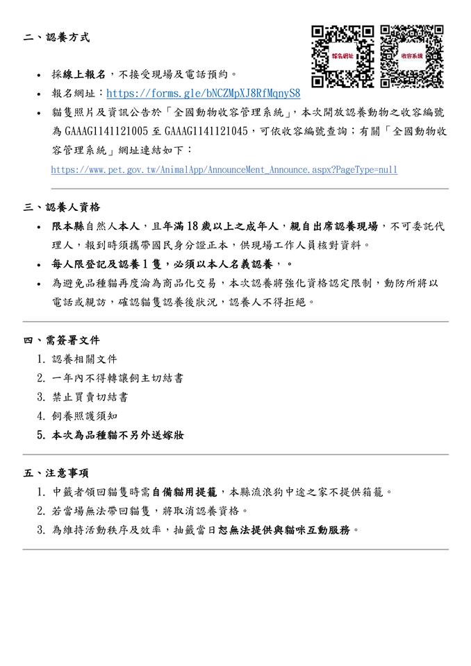 目前所有貓隻皆已完成絕育,且健康狀況穩定,將分二梯次以公開抽籤方式提供民眾認養,因本批為品種貓,為避免本批貓隻被認養後,淪為商品交易,因此本次限制設籍於本縣之民眾認養且1年內不得變更飼主,以利動防所掌握流向,便於後續飼養情形追蹤訪查。