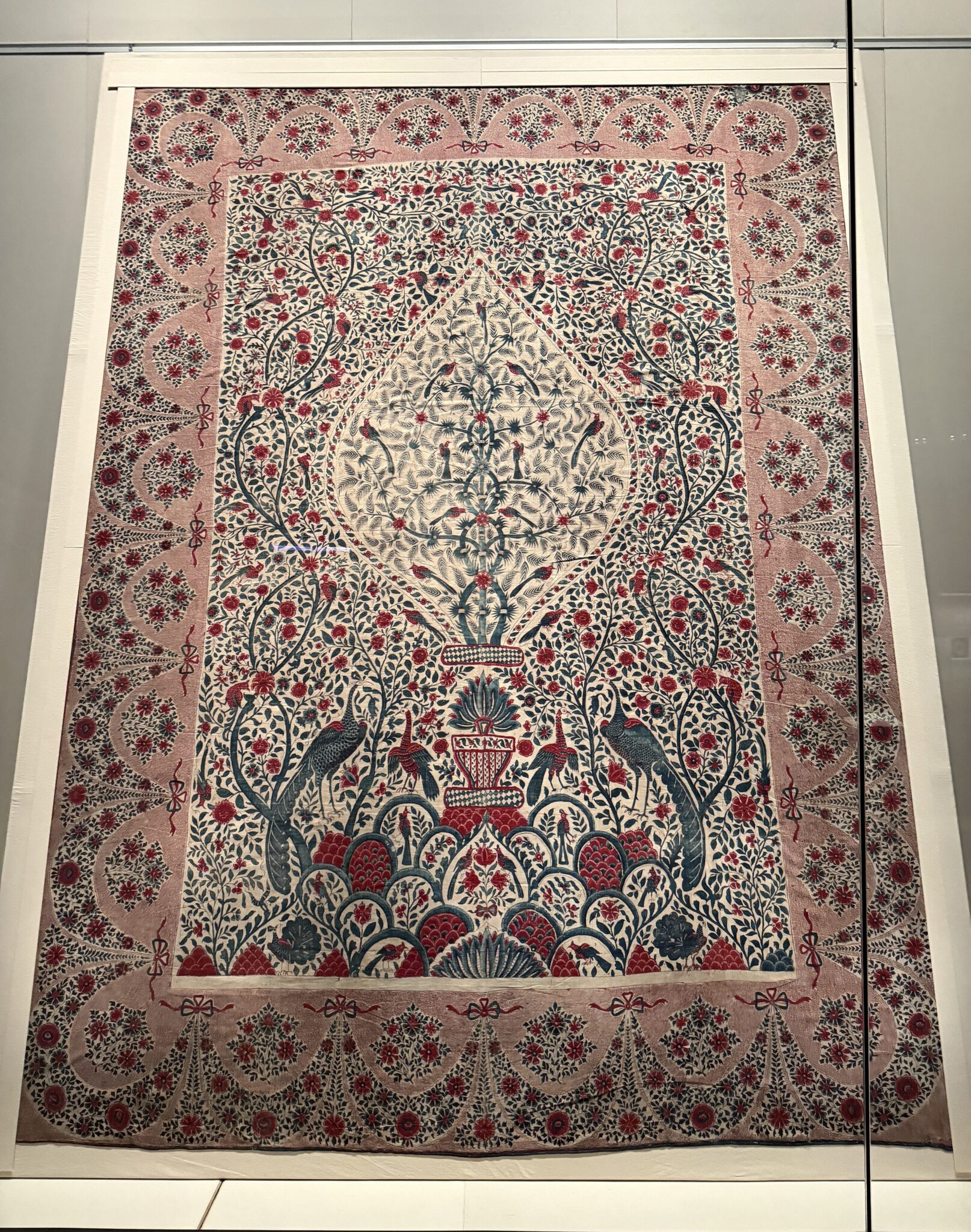 「紋飾巧語-織線的靜謐對話」焦點展件為印度「生命之樹」紋繪染掛飾,推測原用途為窗簾、床罩或壁掛,為當時歐洲流通的高級織品。