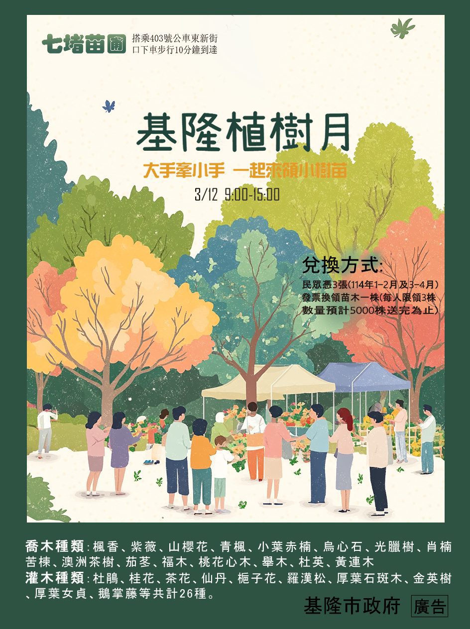 基隆市政府114年度植樹月活動開跑,為鼓勵民眾踴躍參與市容與生態環境之改善,往年相當受到市民歡迎的「發票換樹苗」,今年將於3月12日(星期三)在本市七堵苗圃發放,市府產業發展處歡迎民眾踴躍參與換樹苗做愛心活動。