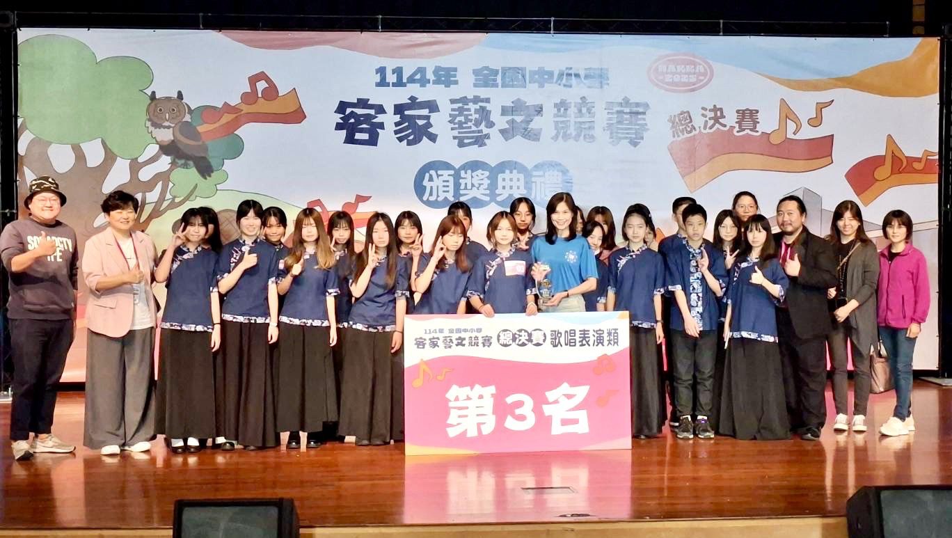基隆市碇內國中榮獲國中組客語歌唱表演類第三名,這份佳績是全體師生長時間努力的成果。為了精準掌握客語歌曲的韻味與細節,合唱團在鐘季霖老師的帶領下展開密集訓練。許多團員在基礎客語發音上面臨不小的挑戰,但他們展現高度的專注、企圖與毅力,反覆進行發音矯正及咬字練習。學生的付出也體現在舞台上,以成熟的演唱技巧與豐富的肢體表現,讓客語歌曲散發出獨特而動人的魅力。