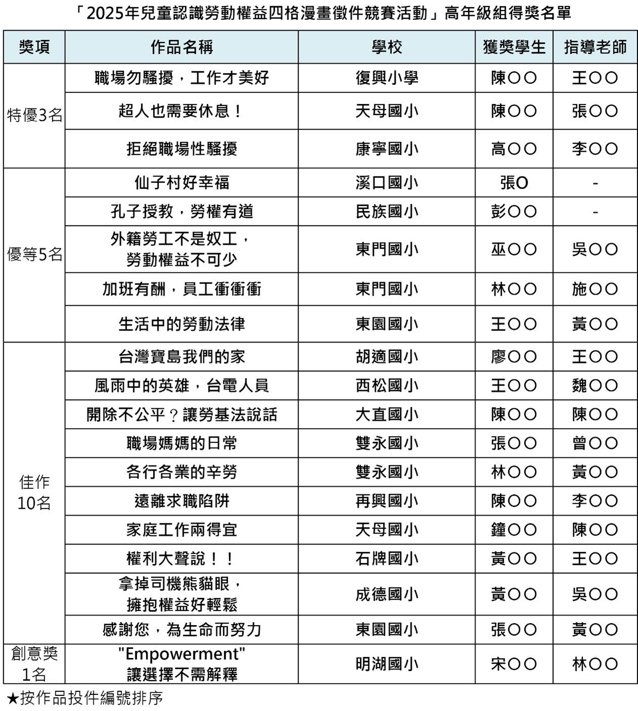 高年級組得獎名單。[圖:勞動局]