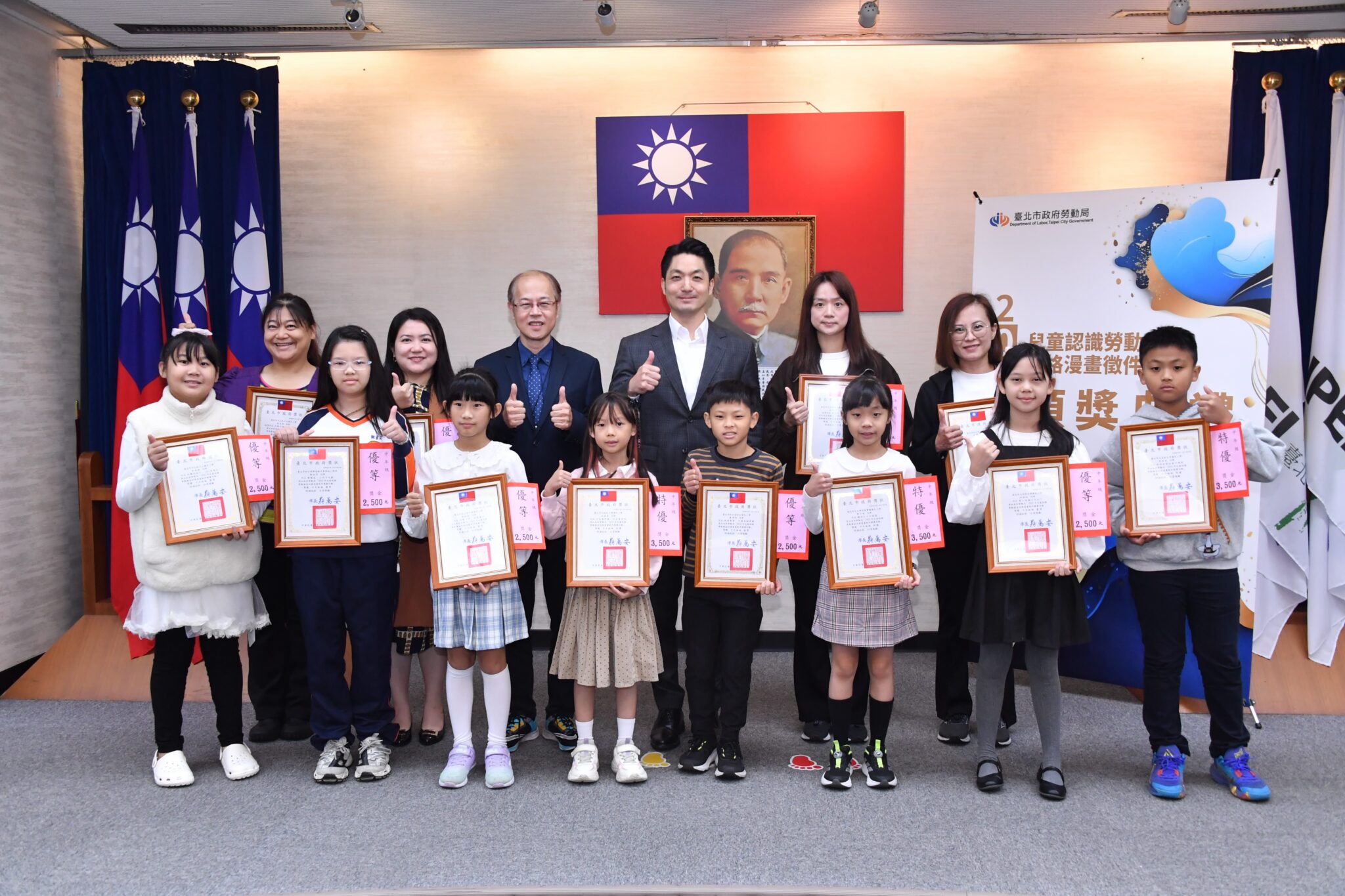 北市政府勞動局舉辦「2025年兒童認識勞動權益四格漫畫徵件競賽活動」,今(9)日上午於市政會議舉行頒獎典禮,由市長蔣萬安頒發獎狀及獎金給獲獎師生。今年徵件活動共計有77校、高達256件作品參賽,蔣萬安致詞表示,肯定勞動教育深耕校園的成果,期許勞動局與教育局持續合作,提升學子勞動素養,為未來職涯發展奠定基礎。