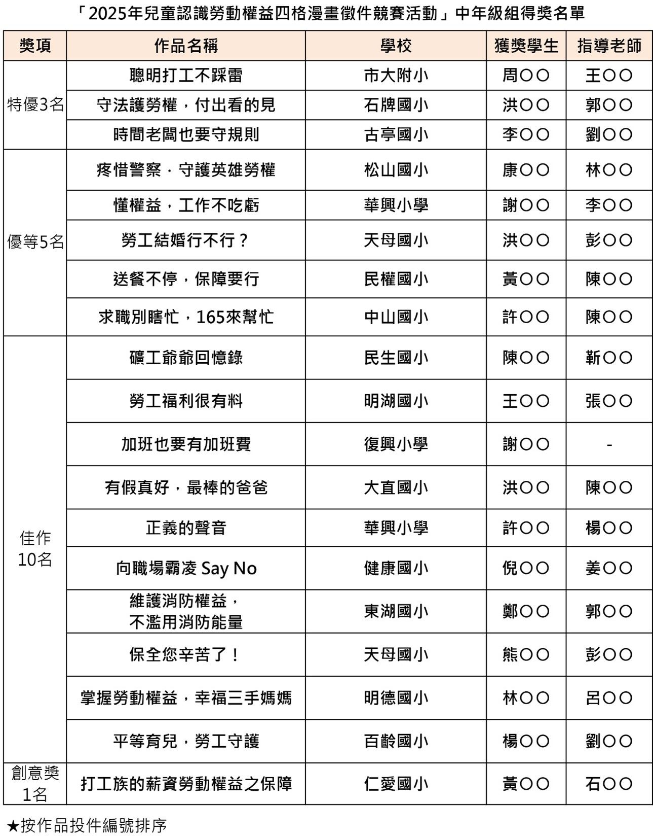 中年級得獎名單。[圖:勞動局]