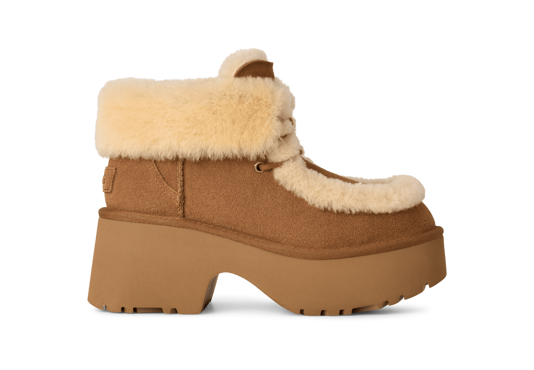 傳承 Esmee 系列的前衛基調與強烈個性,今年以滿覆蓬鬆羊絨與麂皮縫線為主軸,搭配可摺式鞋筒與羊皮翻領滾邊,展現獨特時尚感。內裡採用柔軟 UGGplush,其 2.75 吋甘蔗 EVA 大底兼具輕盈及美型,打造令人著迷的冬季造型。