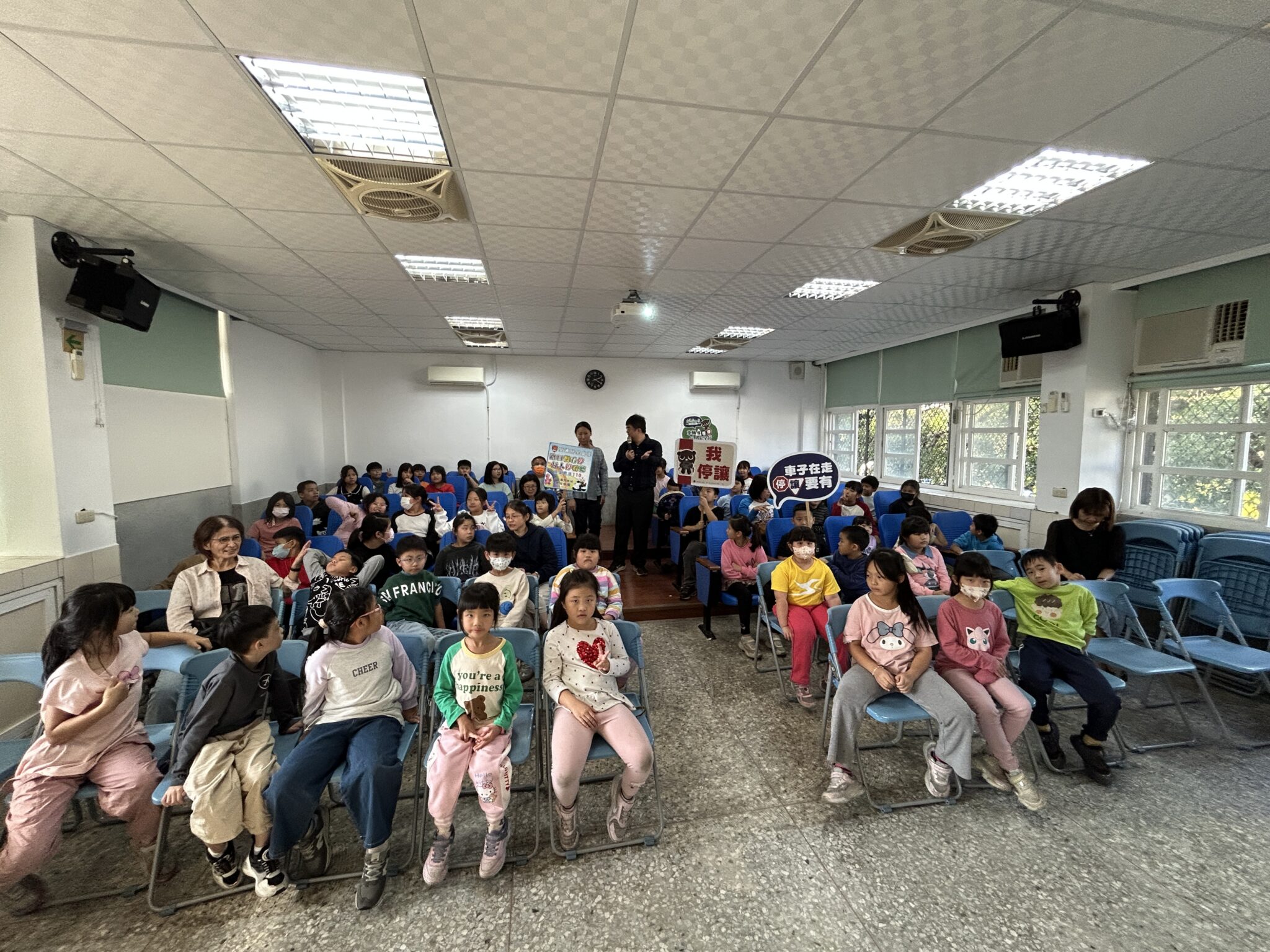 本次宣導內容包括行人過馬路安全、正確騎乘腳踏車及乘坐機車、汽車時的注意事項,搭配生動有趣的簡報教學,並融入情境式有獎徵答,讓學童在互動中輕鬆學習交通安全常識。此外,活動中特別播放防詐騙、網路交友安全及遊戲點數詐騙等宣導影片,提醒學童提高網路使用警覺,遠離詐騙陷阱,宣導現場氣氛活潑熱絡,學童們踴躍舉手搶答,展現出高度參與意願,也藉由有趣互動,將交通安全及防詐知識深植心中。