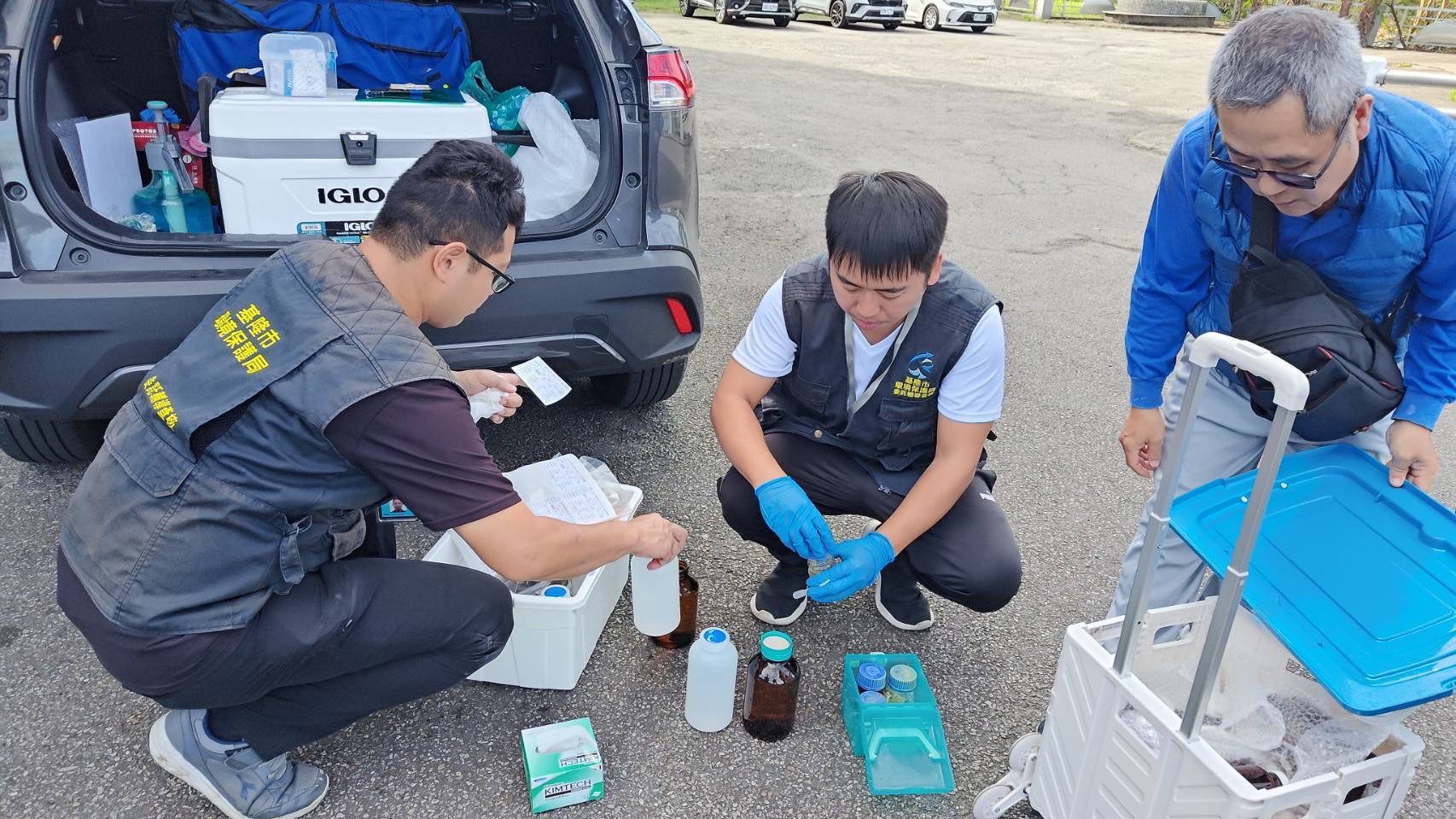 環保局長馬仲豪(上圖中)表示,檢方調查過程中,環保局提供關鍵「將誠公司」可疑事證及採樣等予檢方參考,在檢方的指揮下,方能迅速找出可疑污染源頭。「將誠公司」偷排廢油污水是否與基隆河水污染案有關,檢方將進一步釐清。