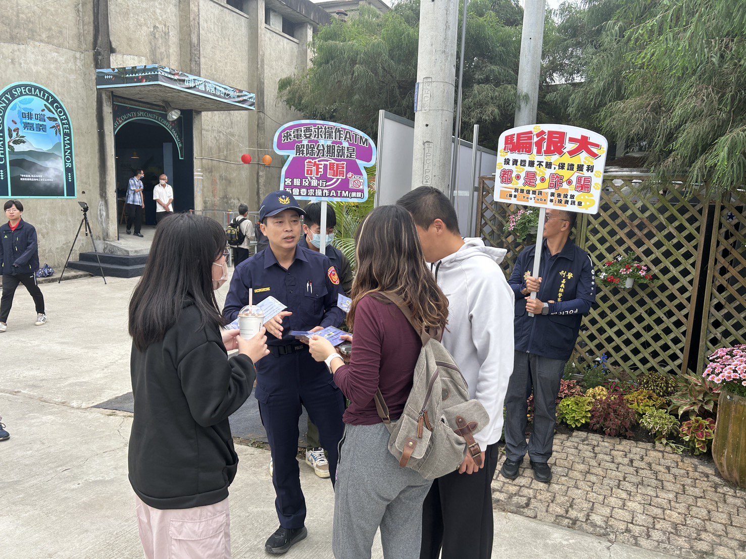 2025全台最具指標性的大型茶文化盛會於12月13日(星期六)至21日(星期日) 在嘉義縣中埔鄉穀倉農創園區盛大登場,藉由人潮聚集之際,中埔警分局長曾裕景帶領員警加強向民眾宣導近期高發的「假交友(色情應召)」與「假投資」詐騙手法,提醒民眾提高警覺,避免落入詐騙陷阱,並推廣「識詐、防詐、拒詐」的重要性。