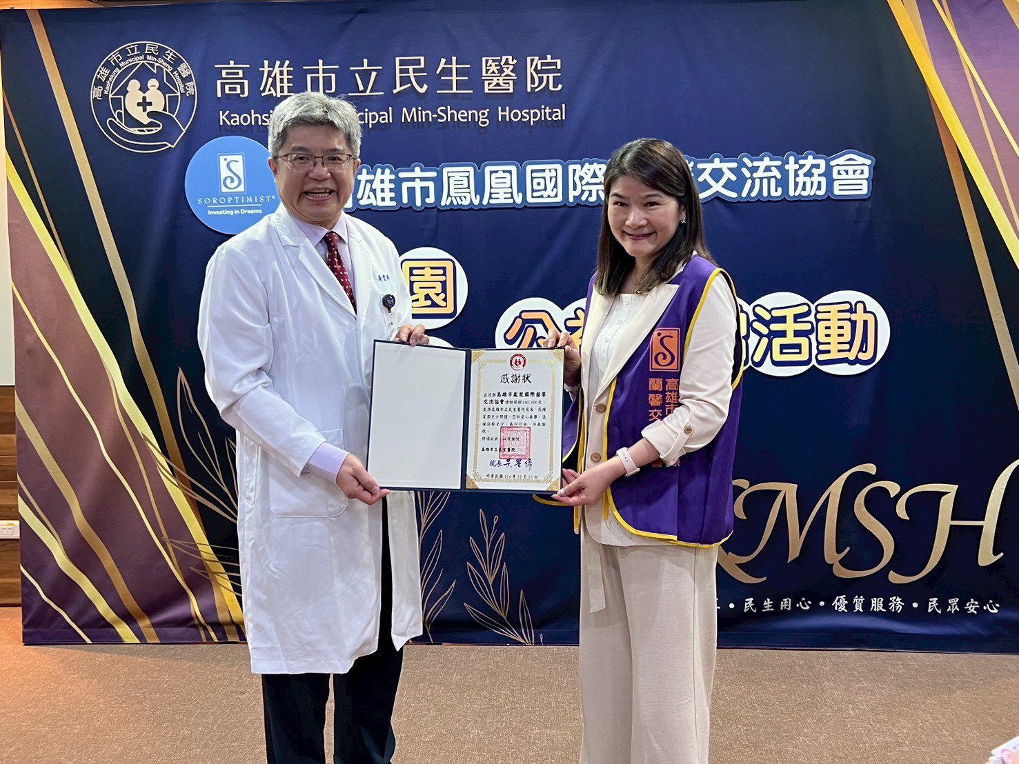 高雄市立民生醫院附設飛象家園與飛躍家園,今(15)日再次獲高雄市鳳凰國際蘭馨交流協會捐贈新台幣20萬元,為家園帶來持續而穩定的資源協助,有助照護能量的提升。民生醫院院長黃豐締感謝其長期支持多重障礙兒少,關懷弱勢兒少不遺餘力,「這份力量不僅是物質挹注,更代表著社會給予孩子與照護團隊的信任與鼓勵。」