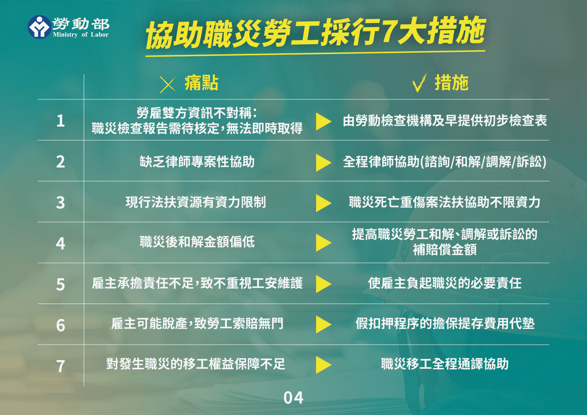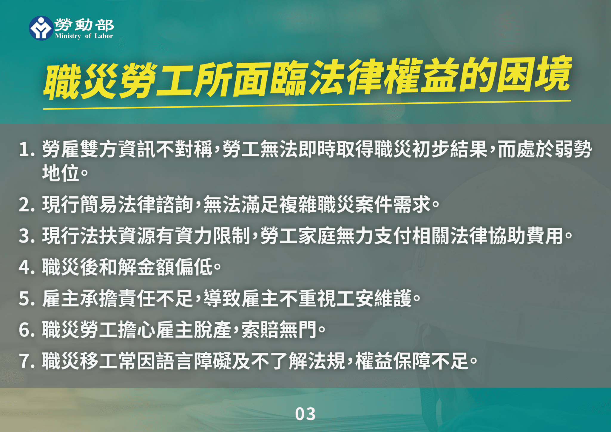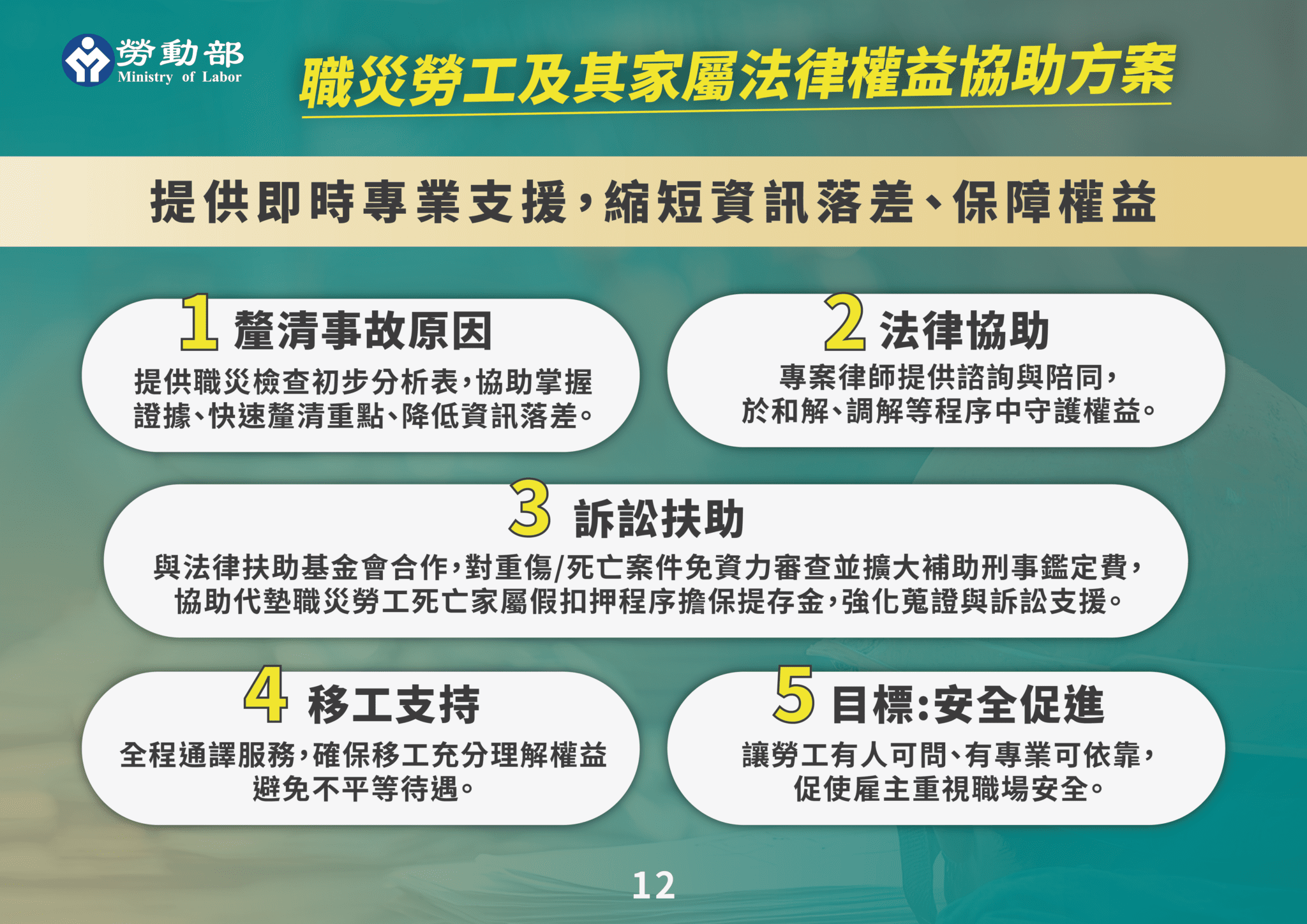 為了協助勞工維護權益,勞動部將於115年推出了「職災勞工及家屬法律權益協助方案」,從職災發生起,即提供全方位的法律支援,包括職災原因初步分析、專業律師諮詢、陪同和解與調解、以及訴訟扶助等,確保職災勞工及家屬能獲得應有的補償與賠償。同時,也促使雇主加強對職場安全衛生的重視。