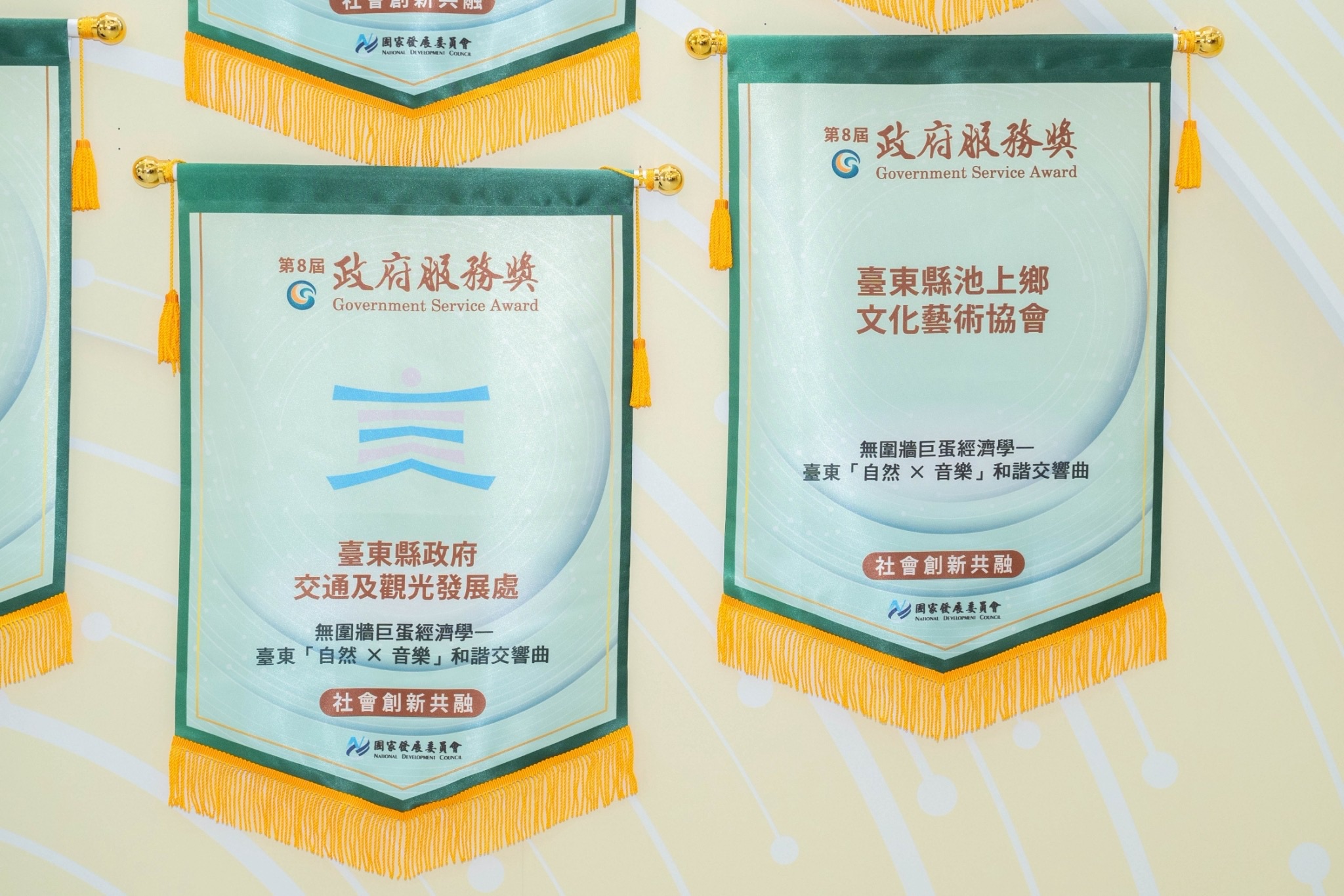 臺東縣政府以「無圍牆巨蛋經濟學—臺東「自然×音樂」和諧交響曲」獲「社會創新共融」組別獎項,而民間協力合作團體「臺東縣池上鄉文化藝術協會」亦共同獲獎,充分展現臺東在官方與民間攜手推動無圍牆音樂觀光發展,及環境永續上的成果與努力;本次獲獎的交通及觀光發展處也是繼第2屆、第3屆獲獎後,再度榮獲政府服務獎最高榮耀肯定。