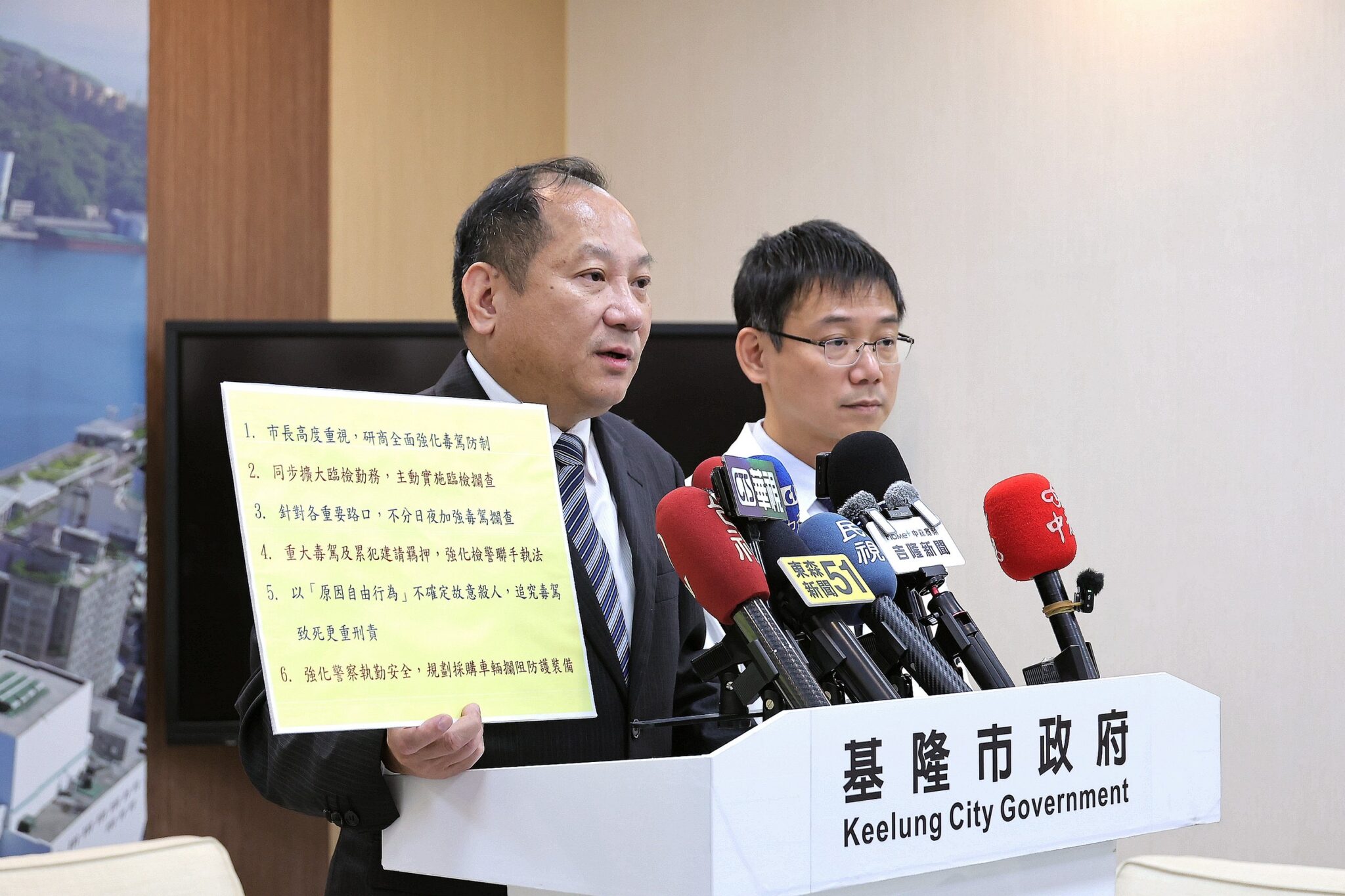 基隆市近期發生毒駕造成重大傷亡案件,市長謝國樑高度重視,昨(15)日即召集衛生局、消防局及警察局進行跨局處研商,全面檢視毒駕防制作為,並指示警察局持續加強攔檢盤查、提高執法密度,同時規劃導入防撞防護設備,確保第一線同仁執勤安全。今(16)日市府召開記者會,重申對重大毒駕案件與毒駕累犯,警察局將建請檢察官聲請羈押,以最嚴格標準處理,展現市府零容忍立場。