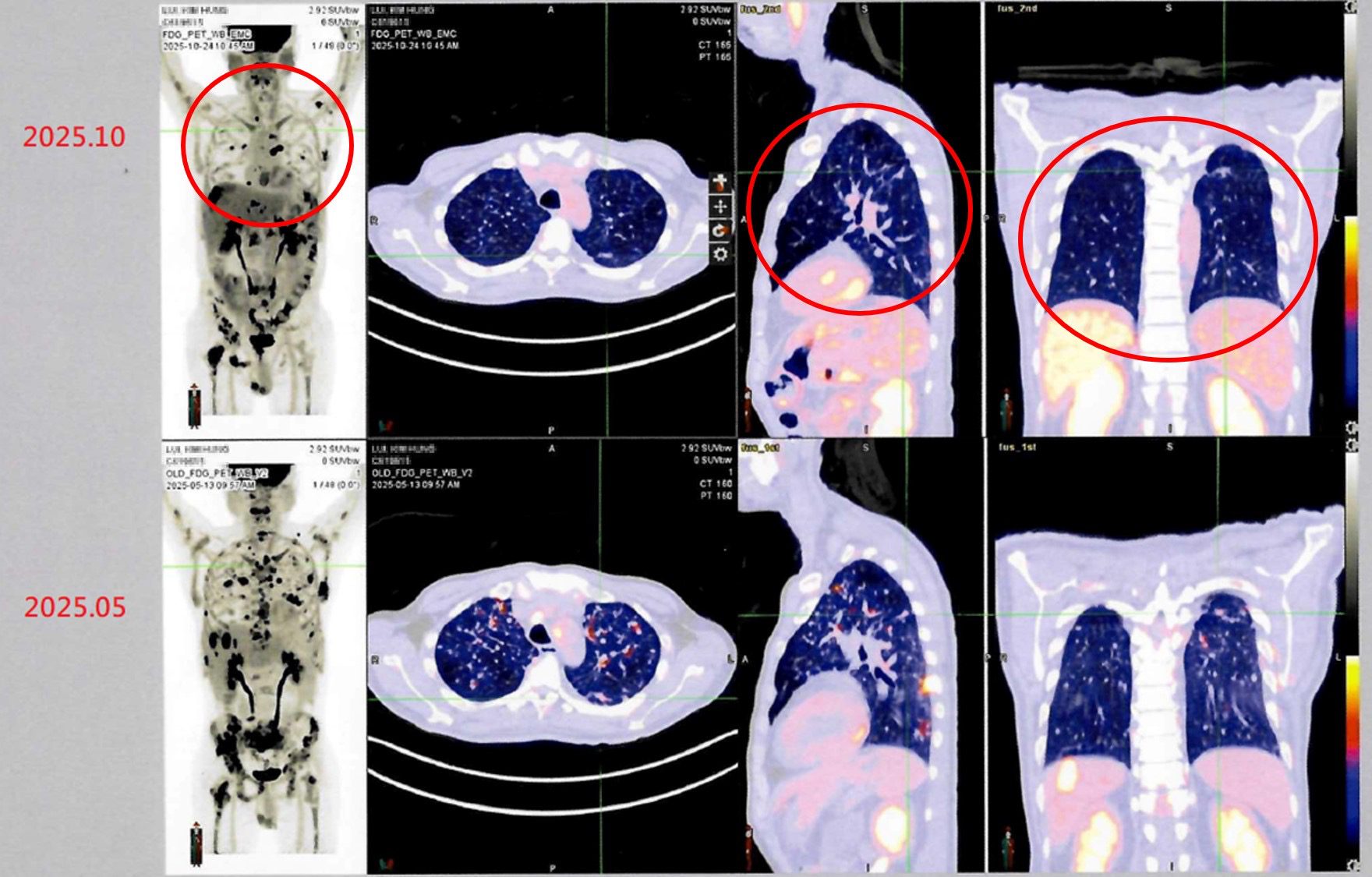 病人接受自體免疫細胞治療(DC-CIK)後,從治療前後影像資料對比(紅圈處),可發現癌細胞減少許多,顯示病情穩定。(照片由衛生福利部雙和醫院提供)