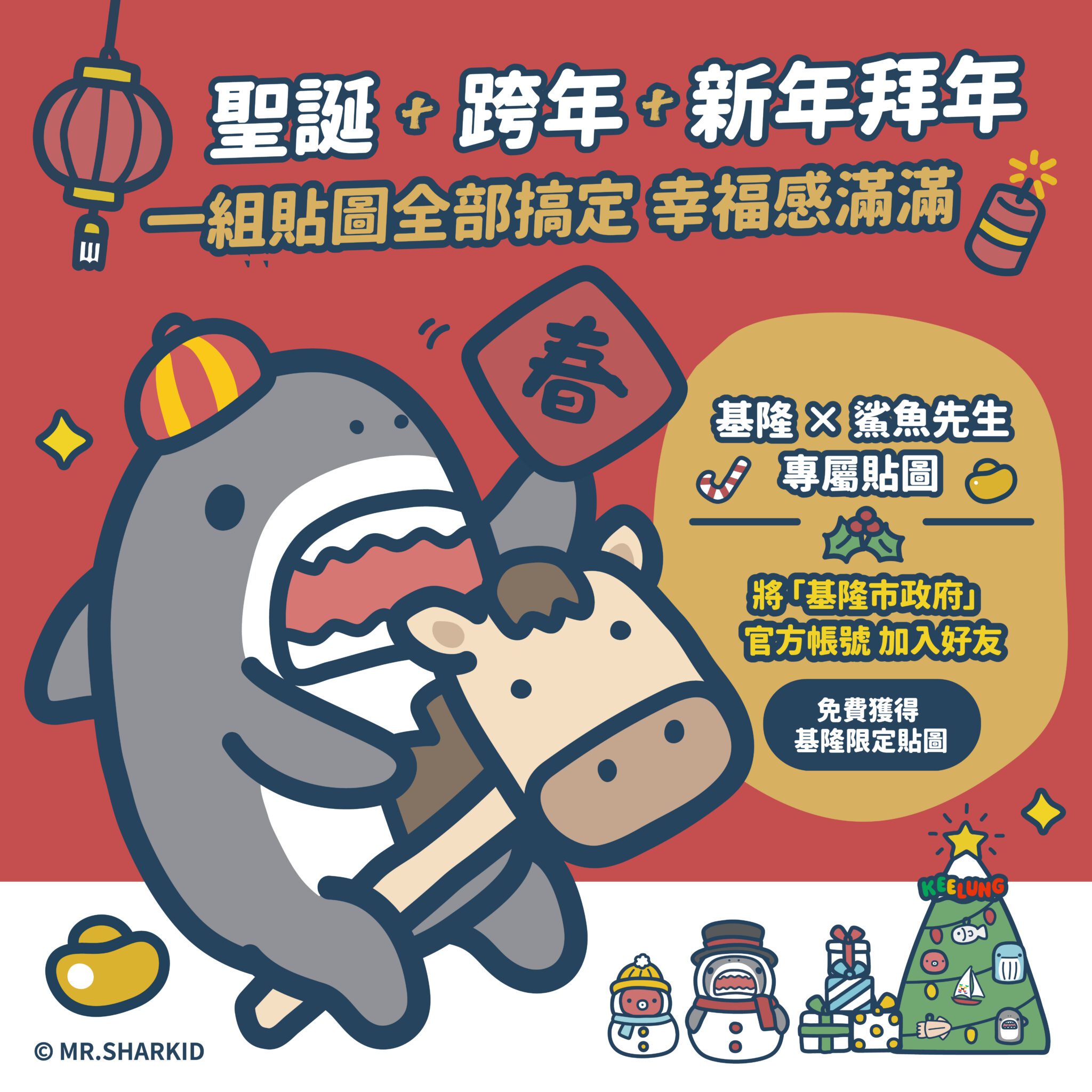 同時推出「鯊」到基隆聖誕驚喜打卡活動,開放募集遊客們的「基隆魔幻時刻」。凡拍下海洋廣場光環境照片分享至個人FB,打卡於「海洋廣場」,同步將貼文設成「對所有人公開」,並於留言區留下「我在聖誕樹下許願!」,即有機會獲得豐富的聖誕大禮,獎品清單豪華吸睛:包括頭獎 Apple Watch SE 3 (1名)、PHILIPS 飛利浦氣炸鍋 (1名),以及家樂福禮券 500 元 (5名)等。所有得獎者更將額外獲贈「基隆文化觀光局與鯊魚先生合作專屬限定紀念商品」乙份。另外「鯊到基隆」獨家line貼圖同時上架,歡迎喜愛MR.SHARK的行家們下載使用,讓超萌的「鯊騎馬」陪你歡樂180天。