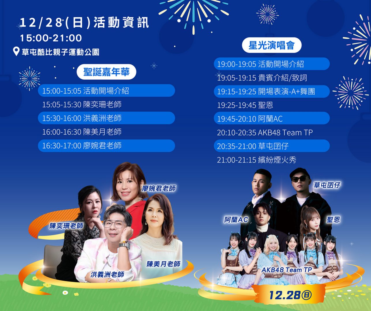 為迎接年末旅遊旺季,南投縣政府與草屯鎮公所首度攜手合作,整合在地教會與觀光資源,推出歷年規模最大的「草屯聖誕煙火嘉年華」。活動將於12月24日、27日及28日登場,不僅有連續三晚的璀璨煙火秀,更邀請安心亞、在地天團草屯囝仔等豪華卡司接力演出,打造草屯最熱鬧的冬季盛宴。