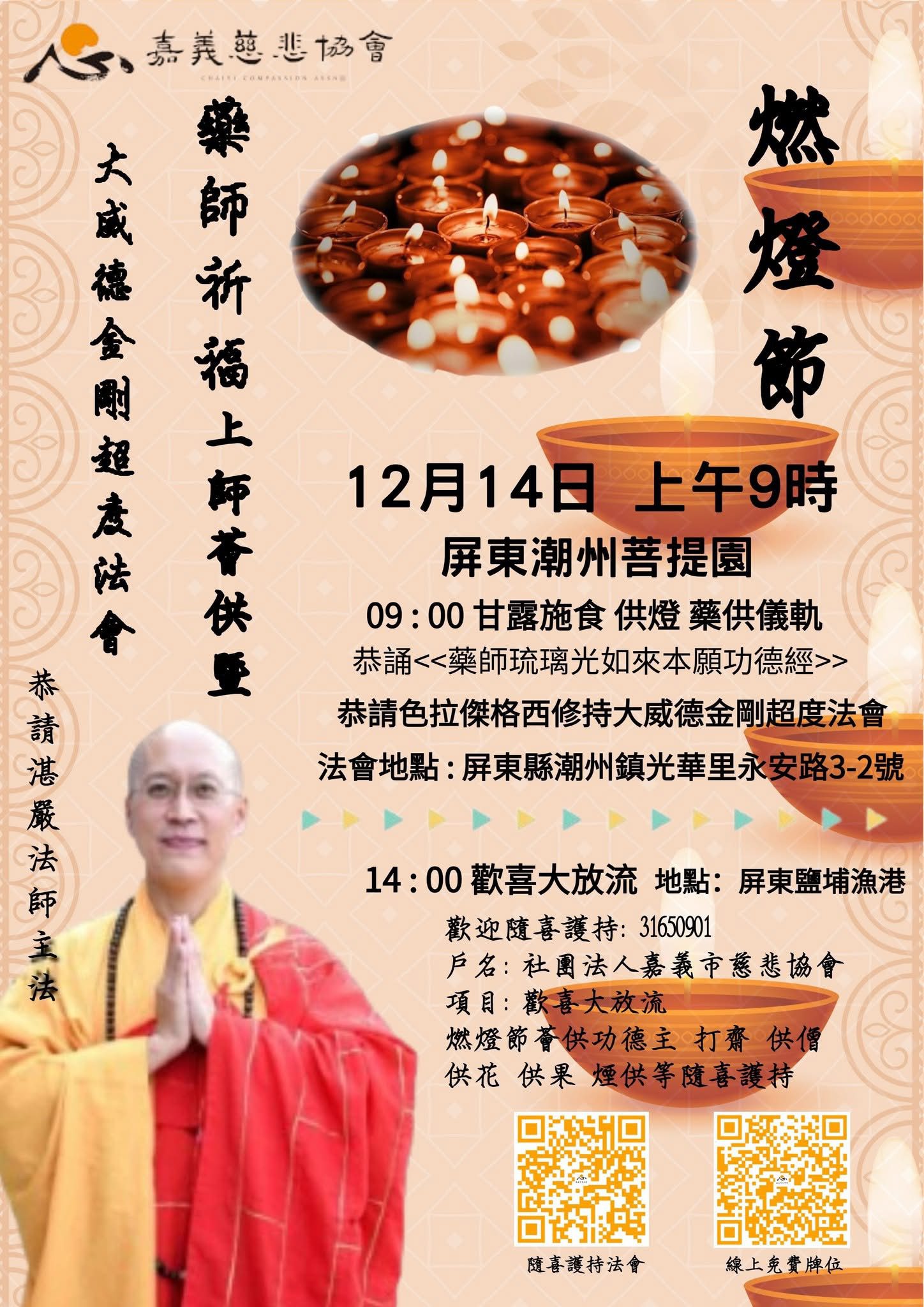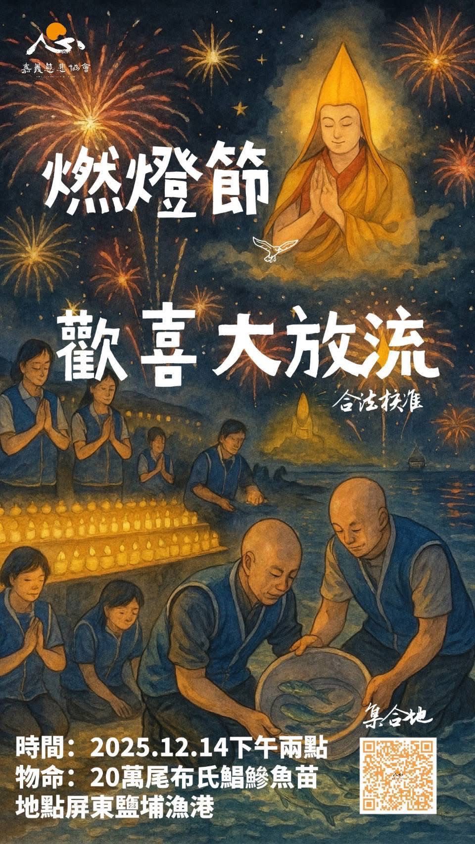 適逢藏傳佛教「燃燈節」(藏曆十月二十五日)殊勝吉日,社團法人嘉義市慈悲協會於12月14日結合宗教儀軌與公益行動,在屏東潮州菩提園舉行供燈、誦經、薈供與超度等共修,並於下午轉往屏東鹽埔漁港舉辦「歡喜大放流」,放流逾20萬尾魚苗。協會亦同步與潮州鎮公所合作,將部分薈供物資整理成關懷禮品,發放給在地中低收入戶與弱勢長輩,讓燃燈節的「光」落在每一個需要被照亮的生活裡。