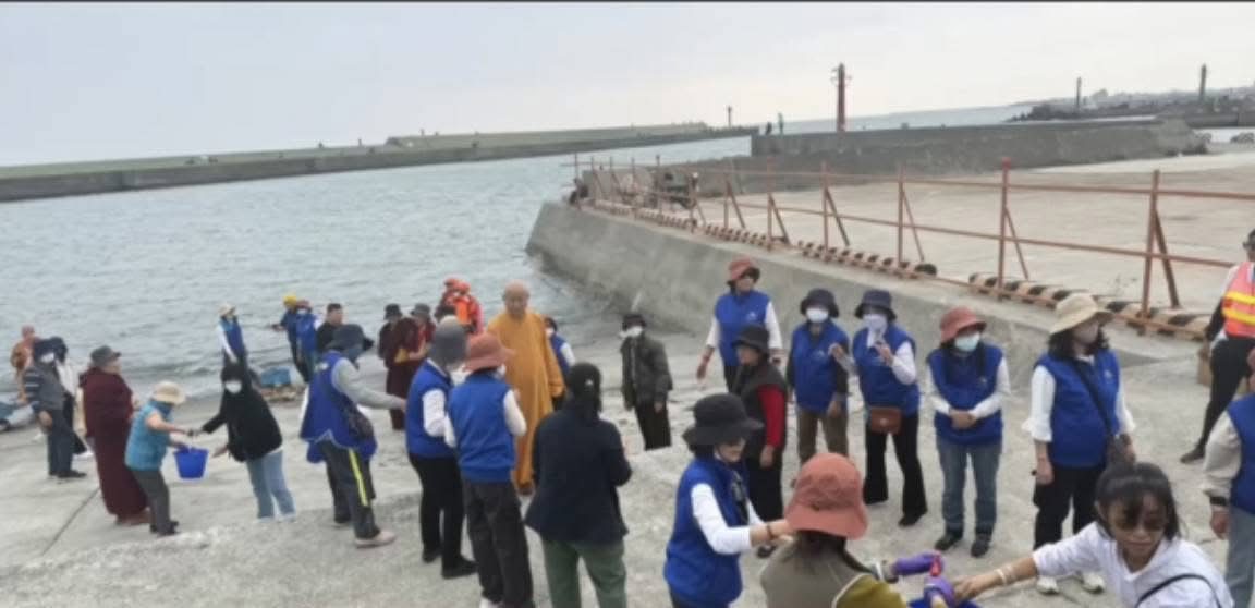 下午在鹽埔漁港進行放流行動,眾人分工搬運、整隊、引導與下水放流,將一桶桶魚苗送回大海。現場不少參與者表示,放流不只是「做功德」,更像是一堂深刻的生命教育:在海風裡學會敬畏、在放手的一瞬間練習慈悲。