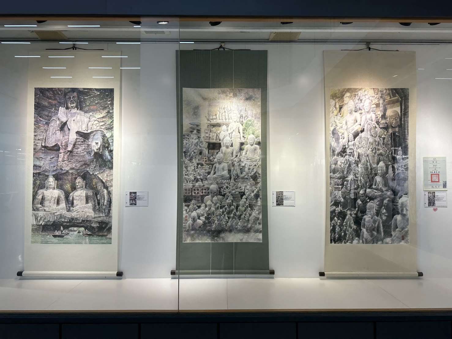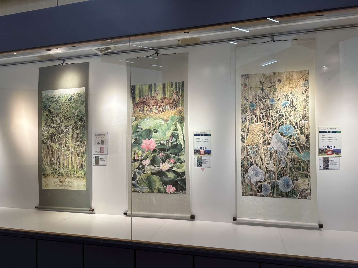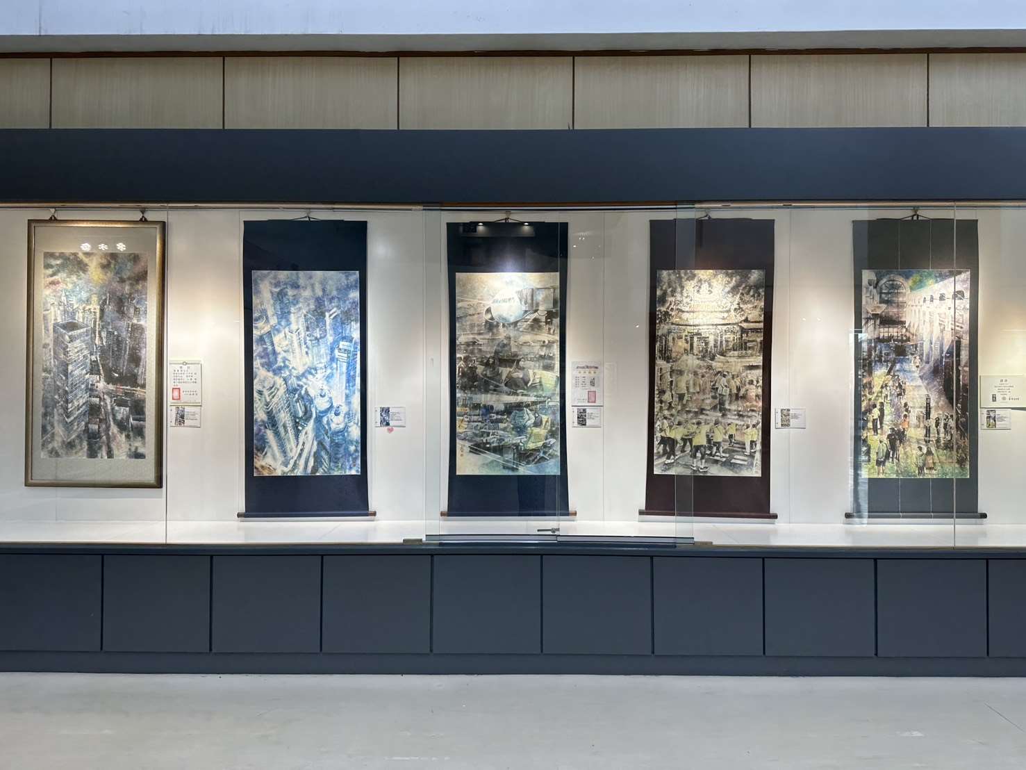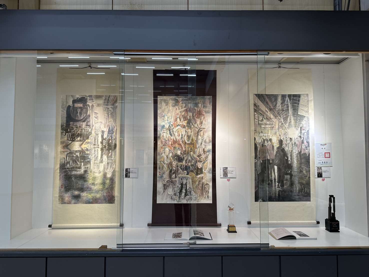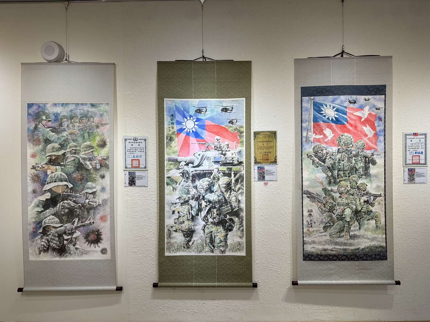 本次展覽特別完整呈現湯老師近年於全國性競賽獲獎的彩墨系列作品,共約30餘件,包括國軍文藝金像獎多件金像獎、銀像獎作品,如《防疫大作戰》、《捍衛與和平》、《戰備》、《軍民同心護家園》等代表作,內容涵蓋國防、防疫、社會關懷與公共議題,展現藝術家以創作回應社會、傳達信念的企圖與深度。此外,湯嘉明老師亦於雲林文化藝術獎表現亮眼,自2010年至2023年間共獲得多項肯定,包括水墨類首獎、西畫類第二名、第三名及入選作品等,足見其藝術創作能量豐沛,並持續以多媒材跨界嘗試與創新,為本縣視覺藝術領域的重要推手。