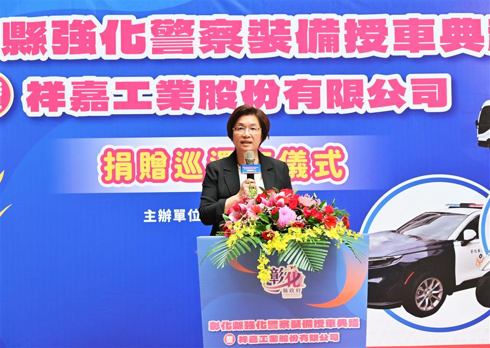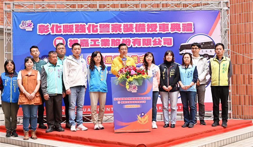 為強化縣內警用裝備,彰化縣警察局於今(17)日在縣警局中庭舉辦「強化警察裝備授車典禮暨祥嘉工業股份有限公司捐贈巡邏車儀式」,由縣長王惠美主持,議長謝典霖、議員及各協勤民力與會。王縣長表示,本次活動不僅見證縣府對警政工作的大力支持,祥嘉工業股份有限公司更慷慨捐贈一輛價值新臺幣 120 萬元的全新巡邏車,共同為提升彰化縣的治安與交通而努力。感謝議長謝典霖及所有議員對縣政預算的支持,讓警察同仁能更順利推展治安維護工作。