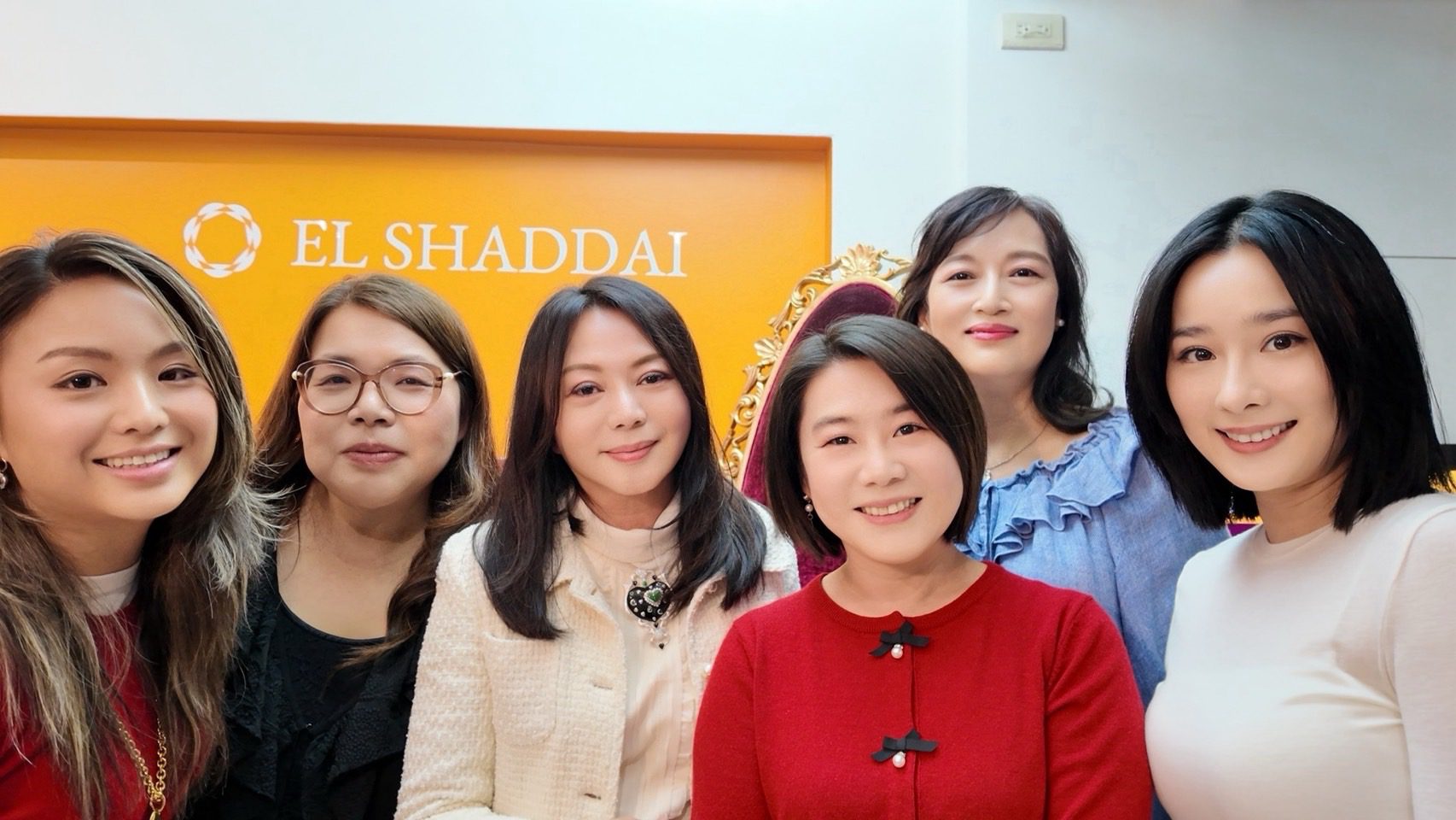 圖:以利沙代負責人湯雅媞、以馬內利莊園總經理陳以斯帖。(前排由左至右)貿易商郭薴襄。生技負責人李雅雯。企業主吳錦玲。經紀公司執行副總郭孟婷。藝廊負責人劉芝蘭。企業主黃逸君。(後排由左至右)