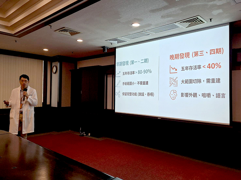 吳俊毅醫師表示,口腔癌連續多年位居台灣十大癌症死因,早期診斷與適當治療是影響口腔癌預後的關鍵因素。根據統計數據,口腔癌第一、第二期的五年存活率約可達到80%至90%,然而一但進展至第三、第四期,五年存活率則降至50%以下。口腔癌主要危險因子包含吸菸、喝酒及嚼食檳榔,其中三項合併者罹癌風險高達一般人的 123 倍。