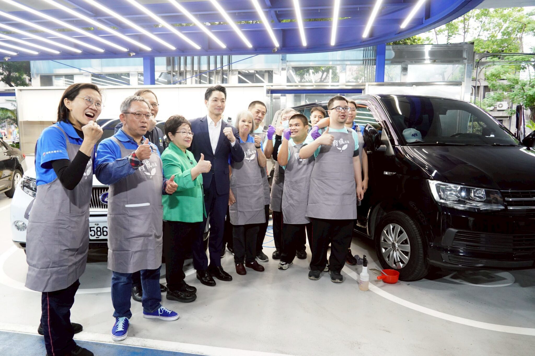 蔣萬安抵達現場,與憨寶貝們逐一擊掌,為他們加油鼓勵。看到他們熟練的洗車、打蠟動作,蔣萬安直呼專業。