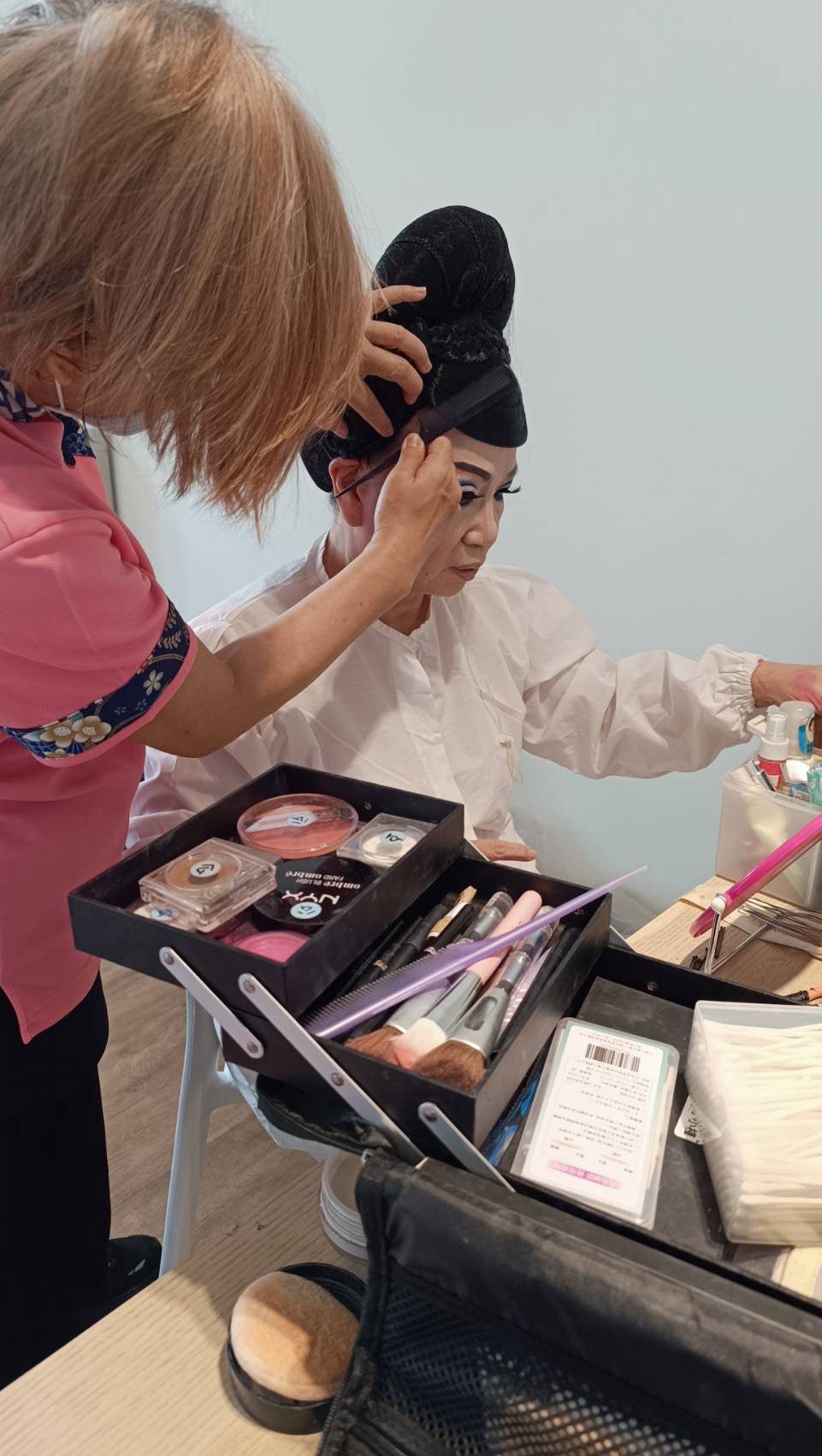 中午前後,團員們便投入梳妝準備。歌仔戲繁複的妝髮與戲服穿著,需要高度默契與彼此照應,大家分工合作、相互扶持,忙碌到幾乎無暇用餐,卻沒有一句抱怨。