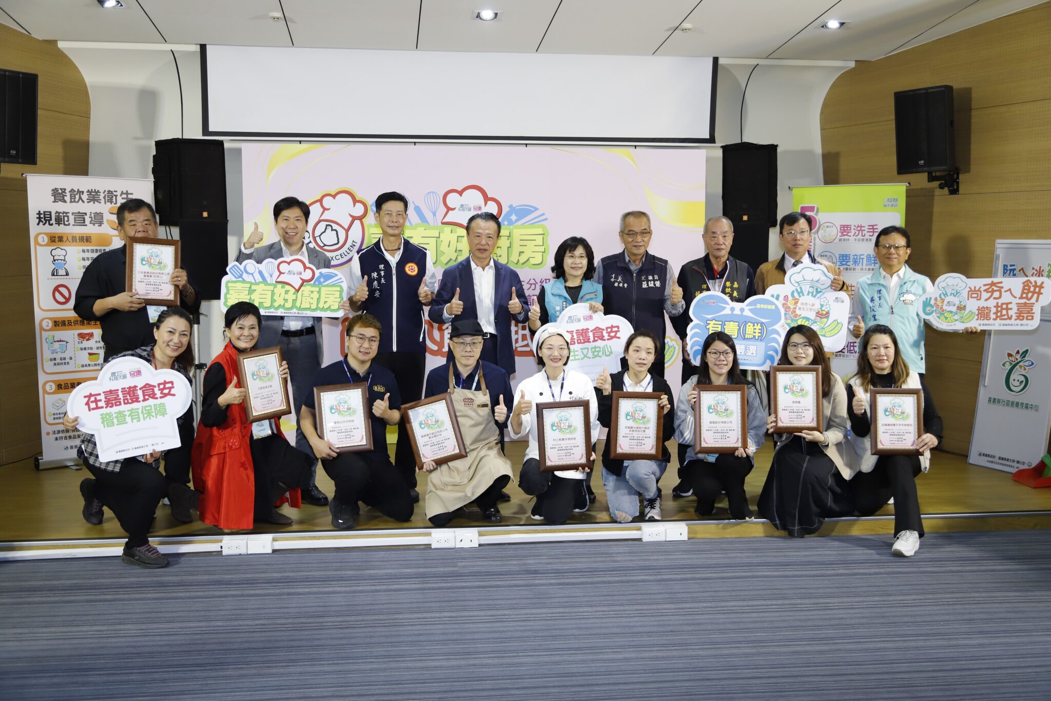 嘉義縣推動「嘉有好廚房-餐飲業衛生分級輔導計畫」,輔導餐飲及烘焙業者更具衛生管理全面性,縣長翁章梁今18日於永在食安大樓頒證表揚通過評核的業者,肯定把關食安的投入與努力,感謝他們建立大眾與食品之間的信任關係。