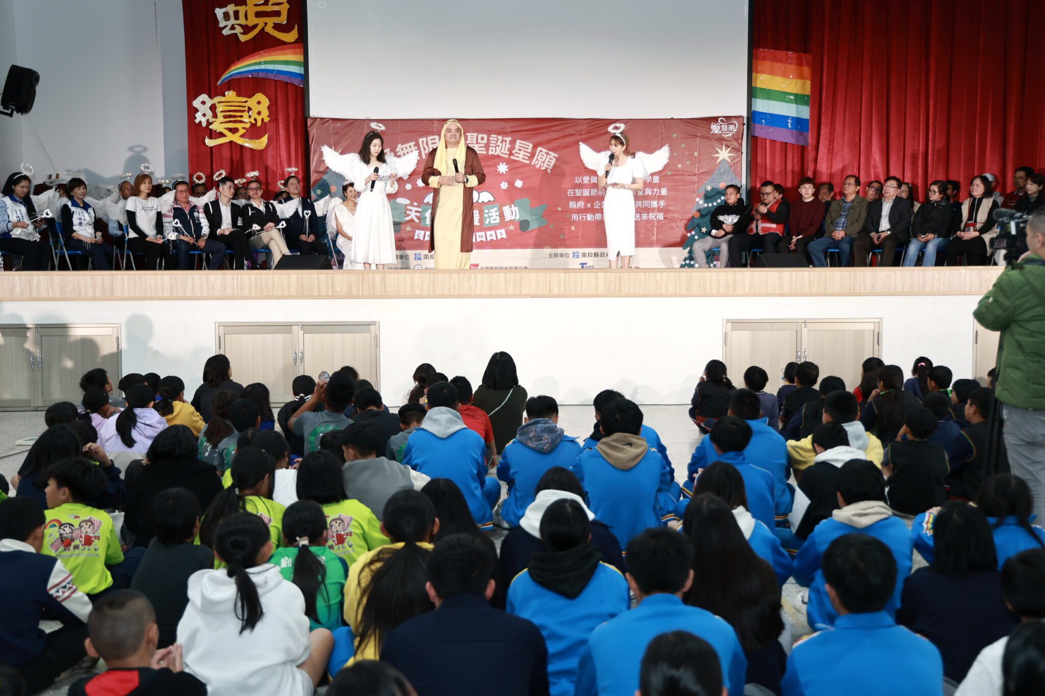 活動由天使報佳音團隊揭開序幕,許縣長率領貴賓們以天使造型進場,開心地與學童互動致意,並與知名歌手林道遠等報佳音團隊帶領現場貴賓及學生一同唱跳《你是唯一》,營造歡樂溫暖的節慶氣氛。