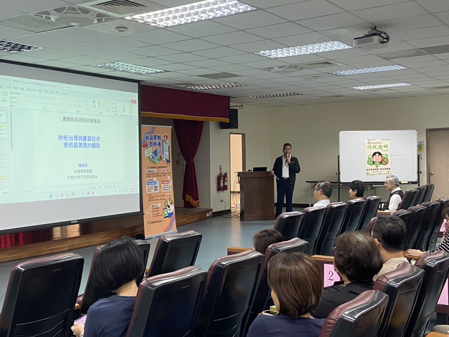 嘉義縣財政稅務局偕縣府政風處辦理「機關行政透明」專案講習,邀請台灣透明組織陳俊明理事擔任講師,協助與會同仁了解國內外行政透明推動現況,深化本縣廉能治理與提升行政透明度。