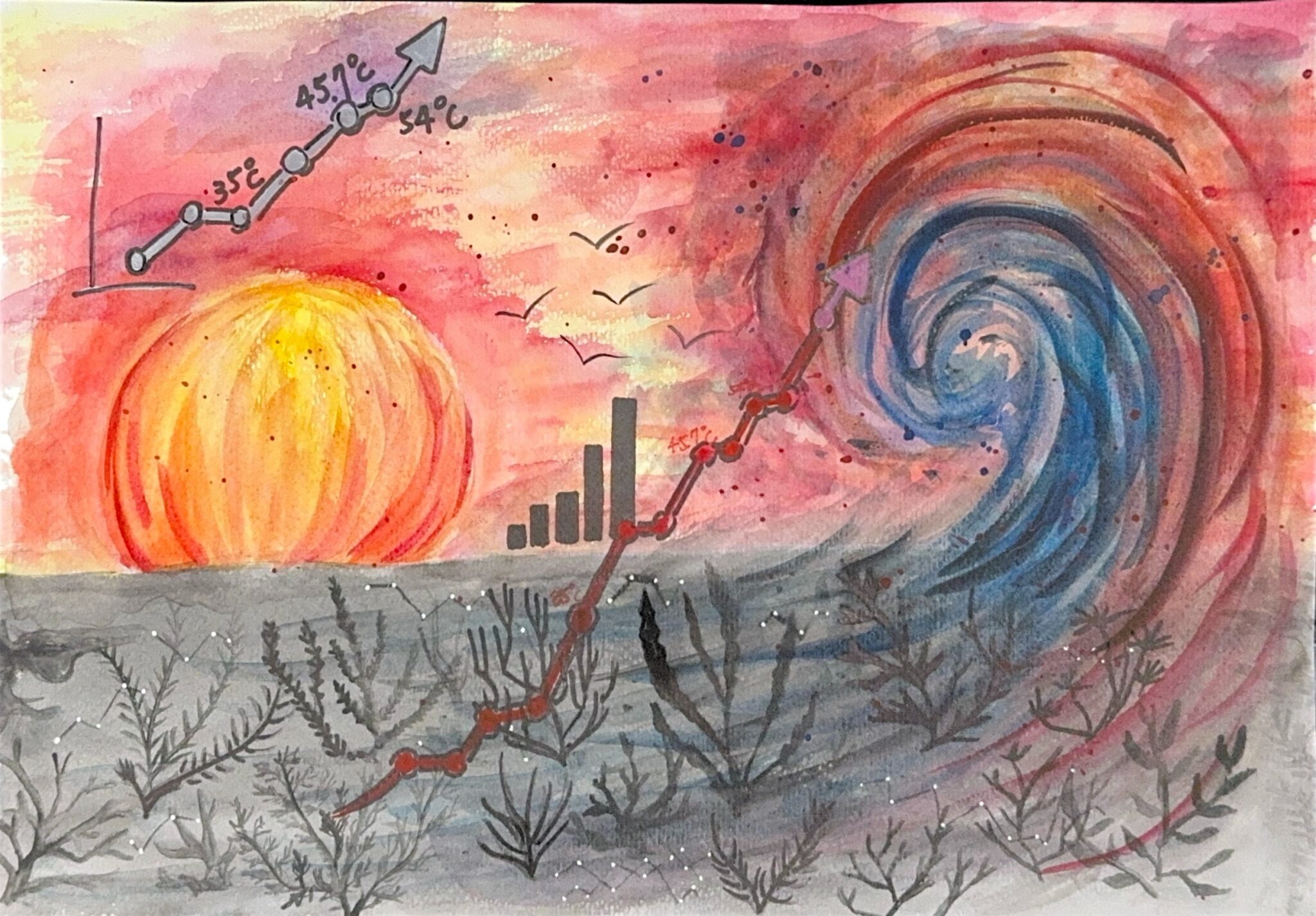 此外, 在NODASS圖文創作項目中,學生們結合生活經驗與NODASS資料庫創造藝文與海洋科學有趣的連結。其中高中組內湖中學畫作的意涵,熱浪造成的火紅場景,天空如火一般熾熱,白化的珊瑚在海底遭到破壞,黑暗的海面宛如被災害消耗殆盡,我們用黑灰色的海洋與珊瑚,象徵已遭到破壞的海洋生態;用橘紅色的海浪,象徵「熱浪」在燒灼海洋;用不斷竄升的折線圖,代表自然破壞下溫度的上升;用長條圖意味著熱浪來襲時溫度上升的快速。