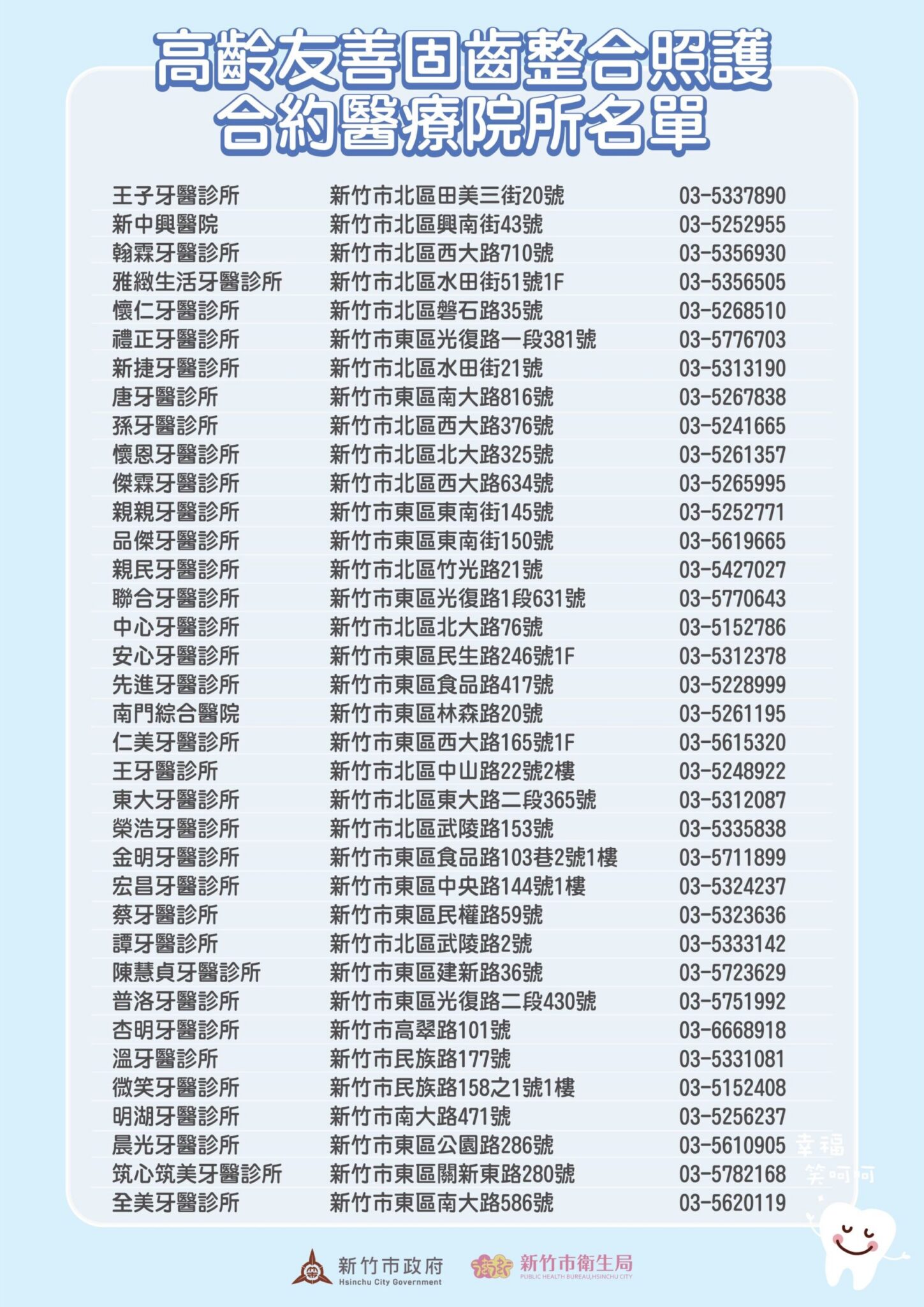 衛生局補充,市府持續提供65歲以上長者及55歲以上原住民免費口腔篩檢,符合資格的民眾可攜帶身分證至轄區衛生所,或至衛生局領取口腔篩檢券,並攜帶健保卡至新竹市36家「高齡友善固齒整合照護診所」,配合醫療診所名單可至衛生局網站查詢 (https://pse.is/745m3q) 免付掛號費及部分負擔做口腔檢查。若民眾有相關假牙裝置及口腔篩檢問題,歡迎電洽諮詢專線03-5355191或撥打1999服務專線。