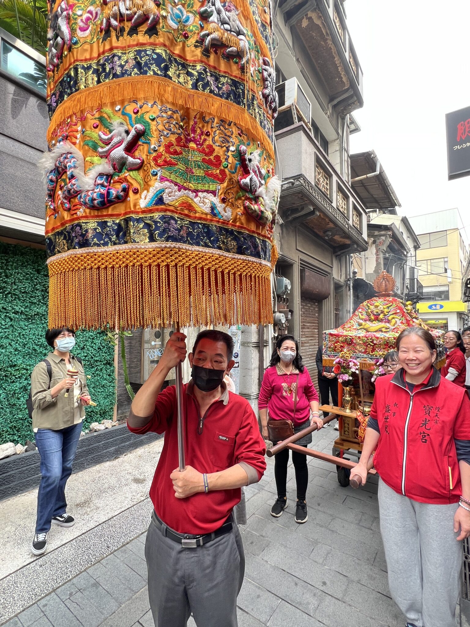 恭請來自廈門的黑面媽祖 上轎巡街遶境,在地信眾隨行繞行天后宮周邊,輪流扶轎、喜悅洋溢。行經各宮廟與寺院時,隨行舞獅與寶傘皆 恭敬致意行禮,沿途宮廟人員亦到廟口上香回禮,展現宗教之間的互敬互信,為地方土地與眾生廣結祝福。