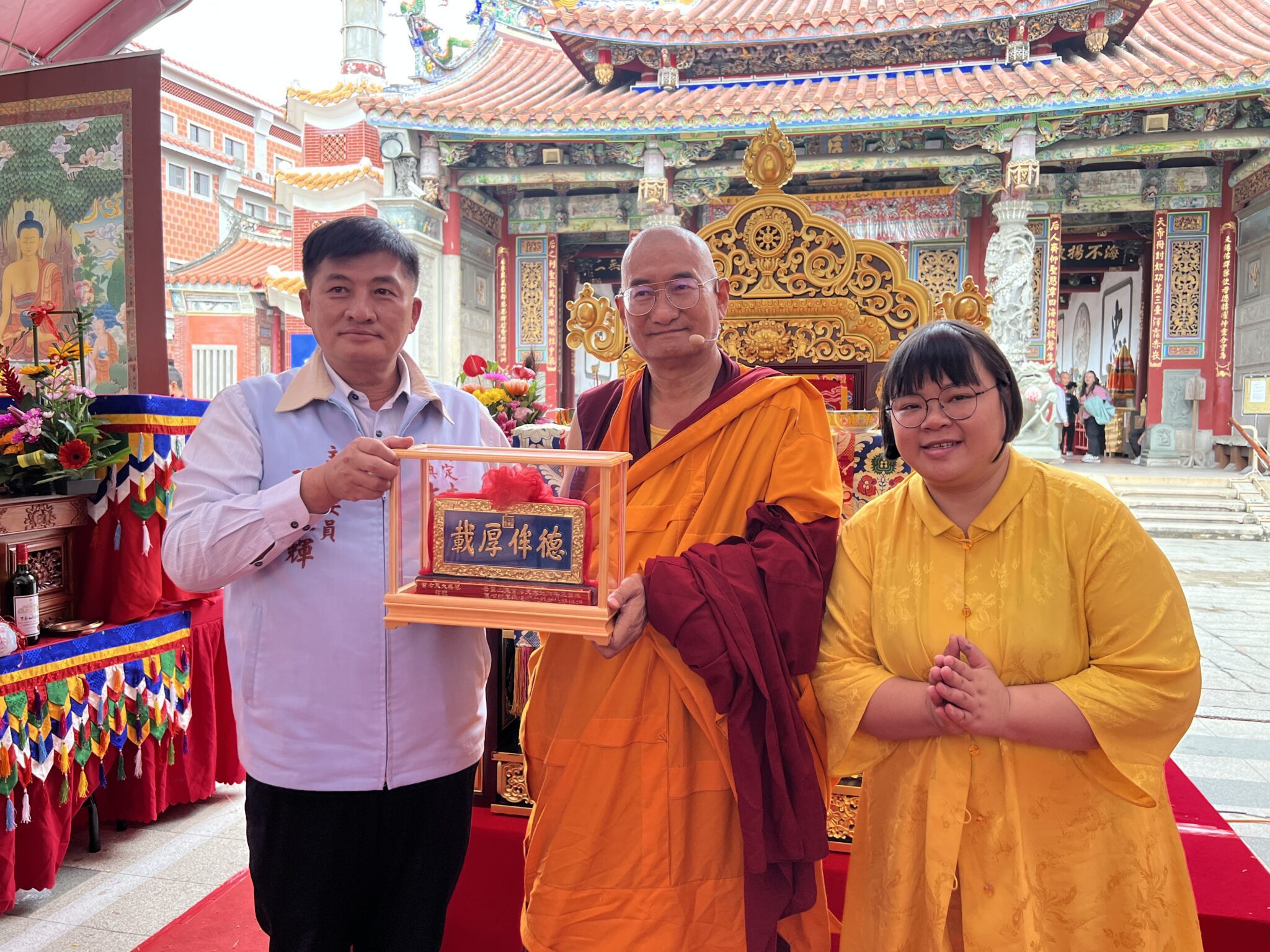 法會期間,大天后宮 主任委員率理監事團隊 蒞臨致意,與法王互贈紀念品。法王特別致贈一尊 莊嚴金色釋迦牟尼佛 予大天后宮,並親筆為媽祖撰寫 〈媽祖祝願祈禱文〉,象徵跨宗派的尊重、信任與祝福,令在場信眾深受感動。
