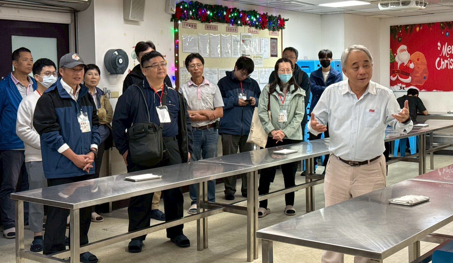 聯華食品基隆廠長張興祥協助企業收容員工示範演練。