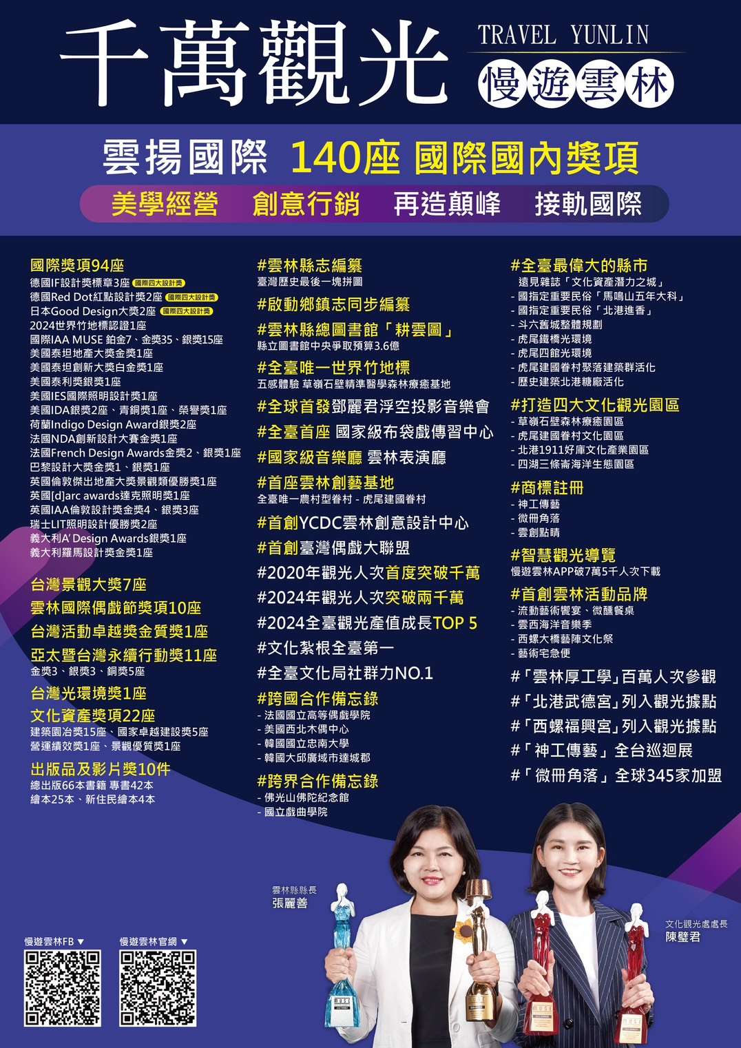 新任副縣長陳璧君為本府文化觀光處處長,自108年就任文化觀光處處長以來,成功在5年內讓雲林觀光人次從700萬飆升到2,000萬,更獲得數十座國際獎項,成功塑造雲林文化觀光的全新形象。