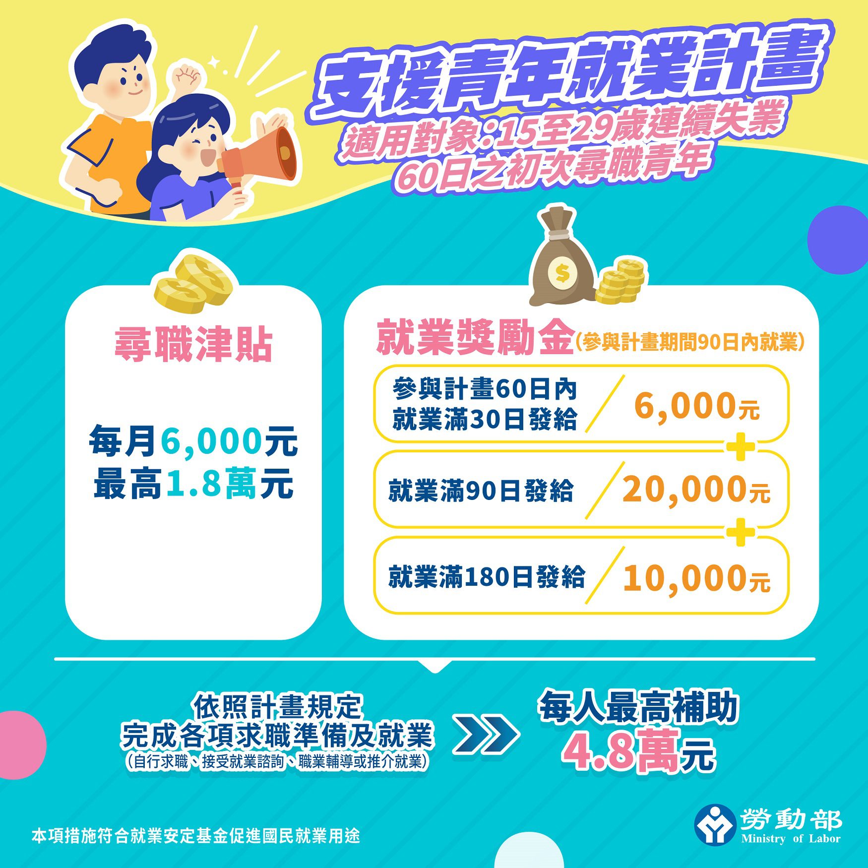▲「支援青年就業計畫」提供年滿15歲至29歲,連續失業達60日的青年申請,最高總計可請領4.8萬元。(圖/潮州就業中心)