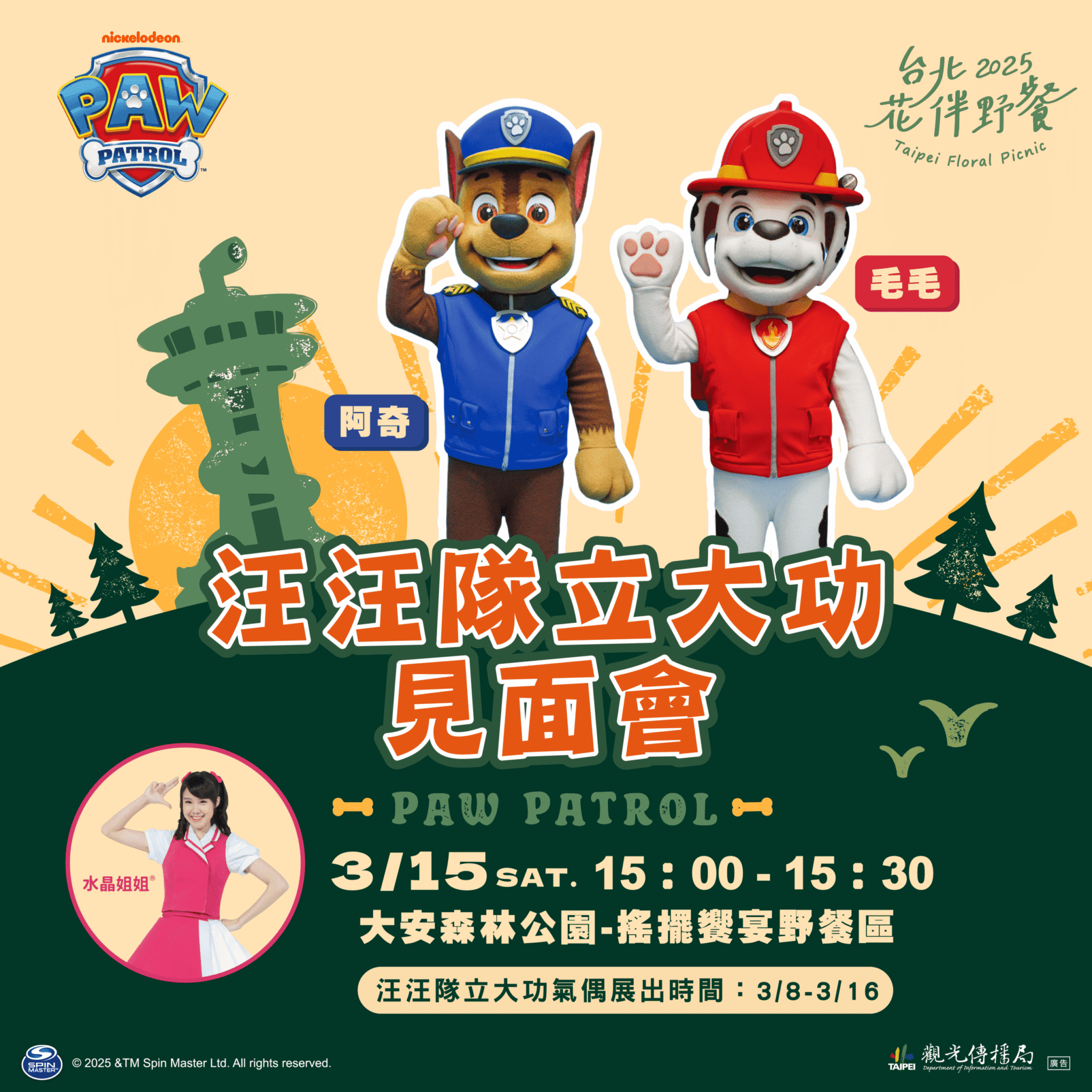 「汪汪隊」出動「2025台北花伴野餐」!今年臺北市政府觀光傳播局特別邀請廣受小朋友喜愛的卡通節目「汪汪隊立大功」,於3月8日至16日在大安森林公園設置六米高的「阿奇」與「毛毛」大型充氣狗狗,邀請民眾尋找他們的可愛蹤跡,並合影上傳社群平臺,有機會獲得限量汪汪隊著色繪紙。